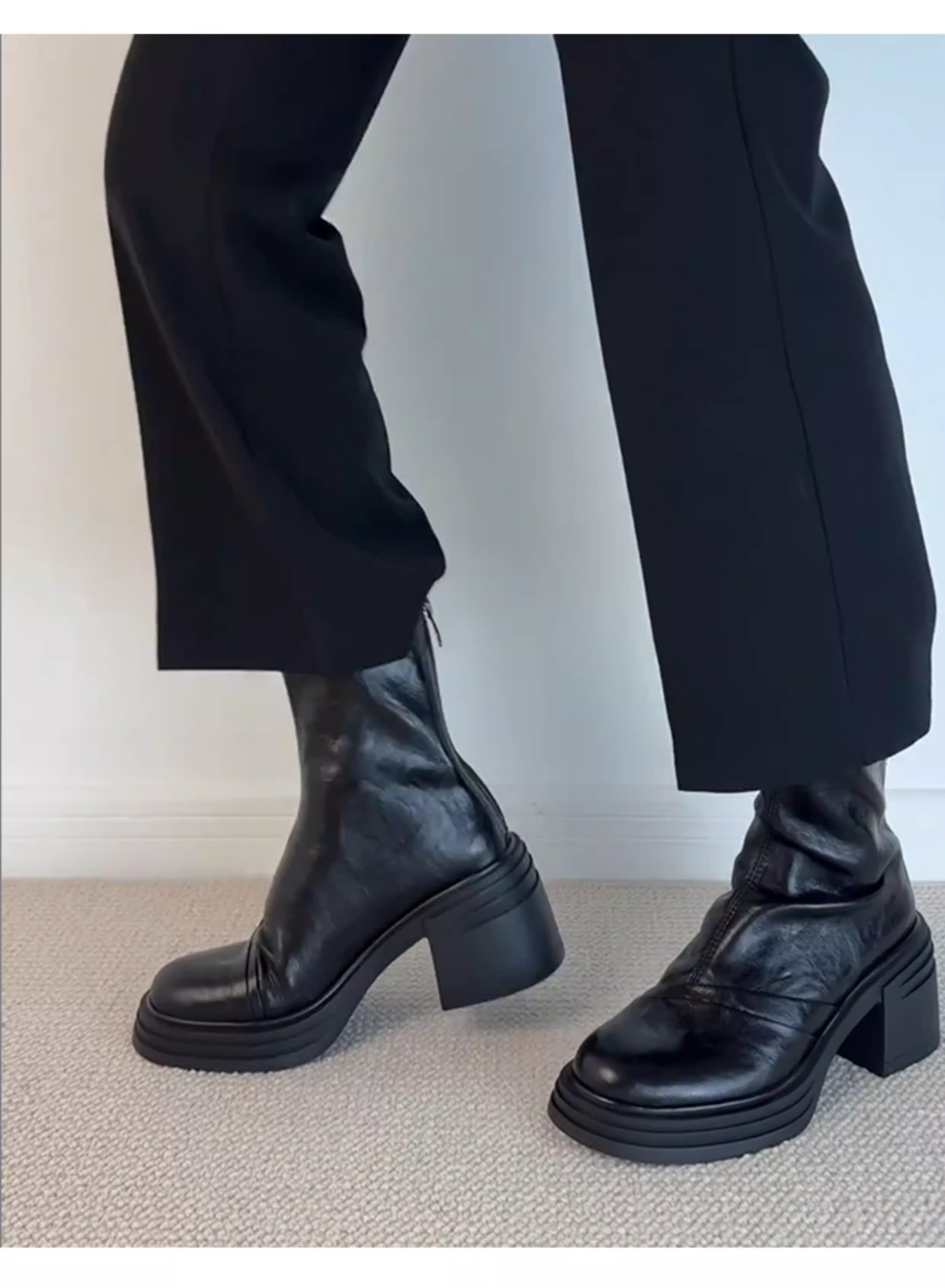 - Phiên bản da bò ~ Giày bốt đế dày mũi tròn co giãn kiểu Anh dành cho phụ nữ nhỏ nhắn, tăng chiều cao, gót dày đơn giản, bốt ngắn có khóa kéo phía sau