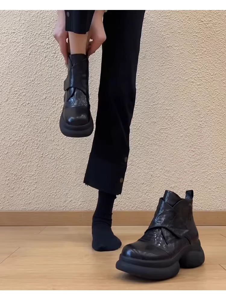 - Phiên bản da bò ~ Giày bốt Martin đế dày mới tăng chiều cao dành cho phụ nữ nhỏ nhắn, giày bốt ngắn thời trang đa năng bằng da thật có khóa dán đơn giản