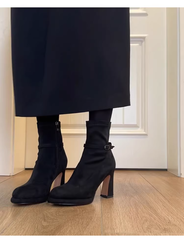 Phiên bản da bò ~ Giày bốt mỏng bằng da thật mờ dành cho nữ, giày bốt Martin cao gót có khóa kéo bên hông kiểu cổ điển với đế chống thấm nước, bốt ngắn màu đen.