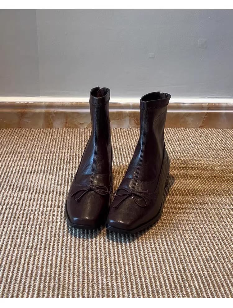 Phiên bản da bò ~ Giày bốt mũi vuông kiểu ba lê đơn giản theo phong cách Anh Quốc dành cho nữ có khóa kéo phía sau Giày bốt ngắn đi làm có gót thấp