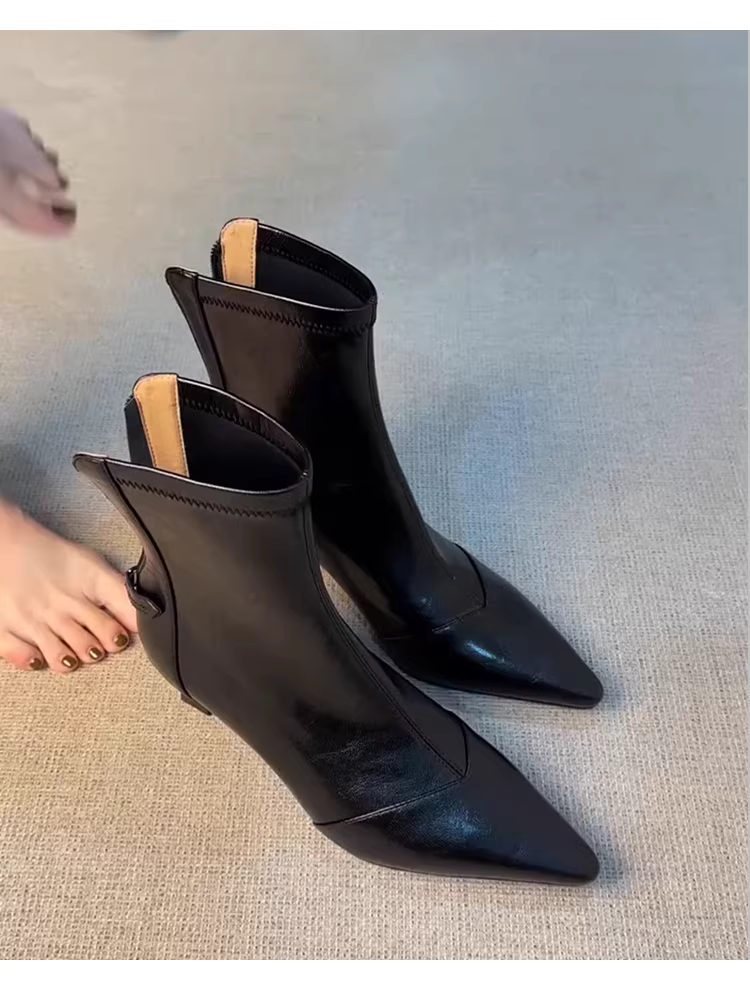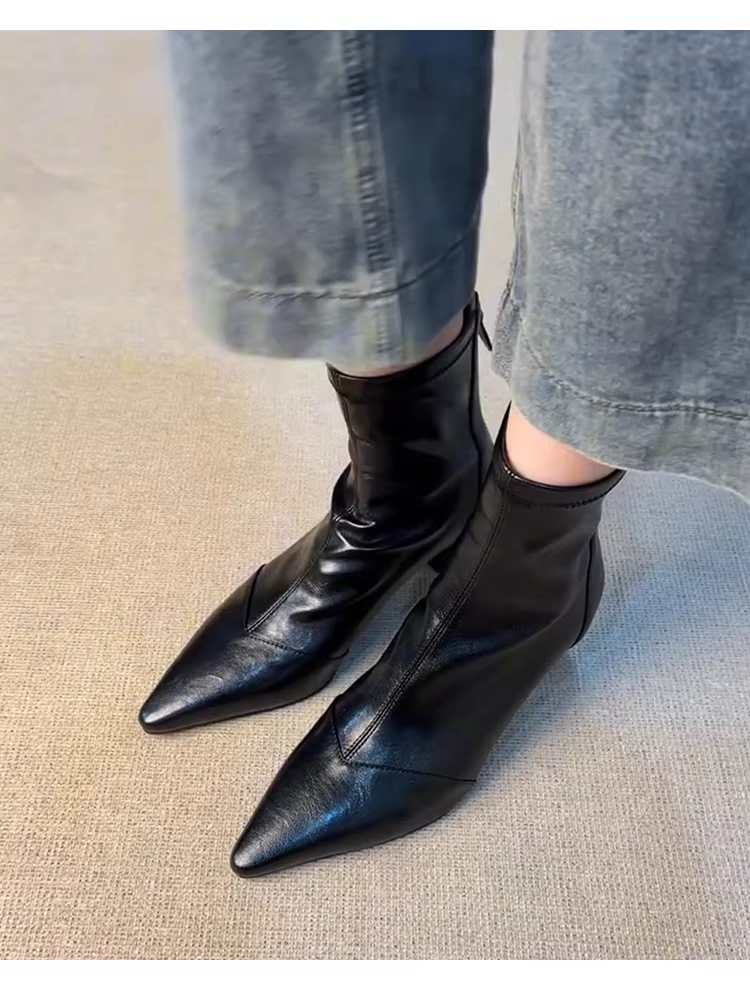 - Phiên bản da bò ~ Giày bốt ngắn cao gót mũi nhọn sành điệu dành cho nữ, bốt da thật kiểu Pháp co giãn ôm dáng, bốt Martin đa năng giúp thon gọn.