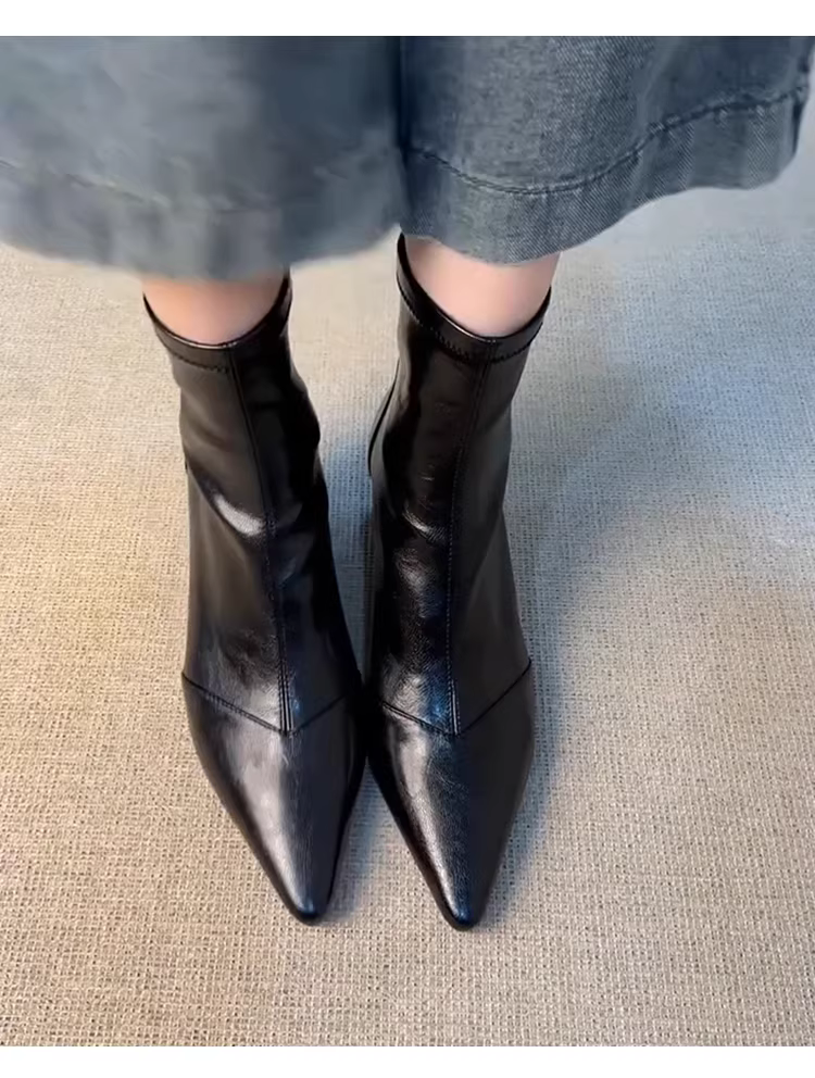 Phiên bản da bò ~ Giày bốt ngắn cao gót mũi nhọn sành điệu dành cho nữ, bốt da thật kiểu Pháp co giãn ôm dáng, bốt Martin đa năng giúp thon gọn.