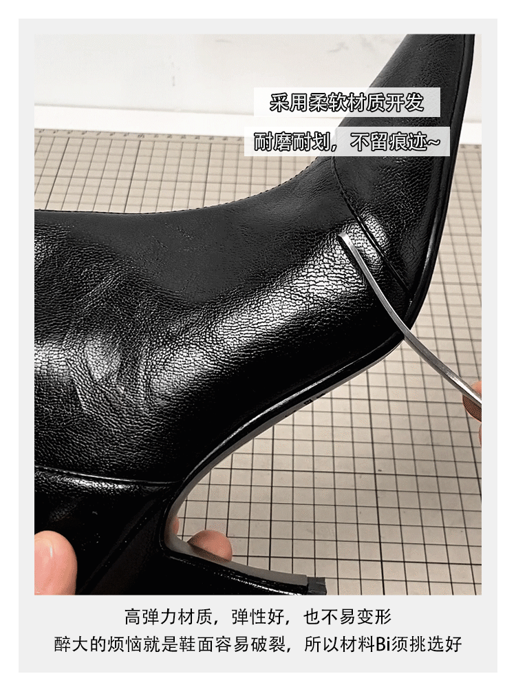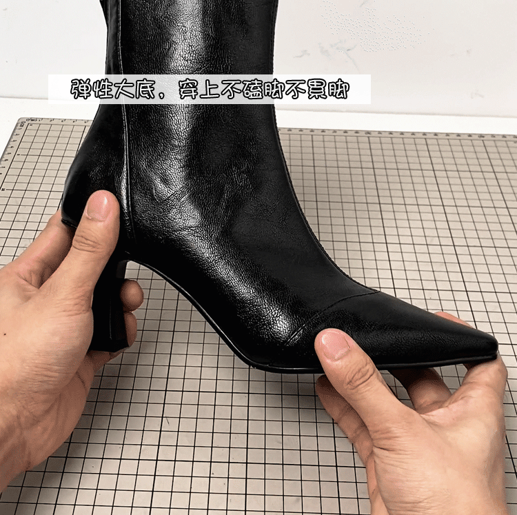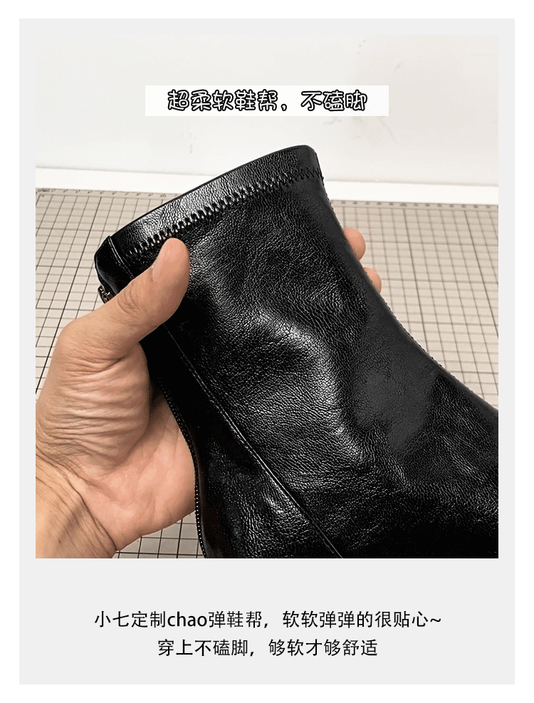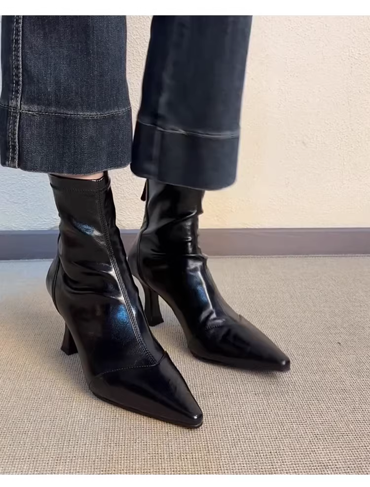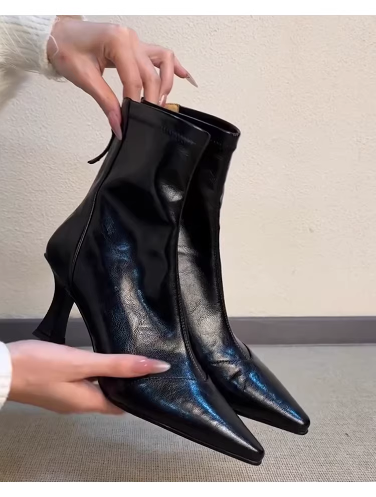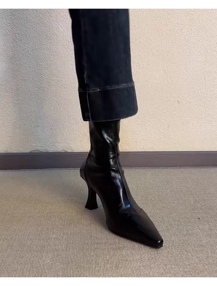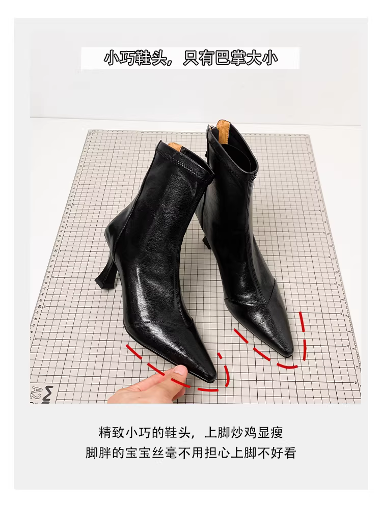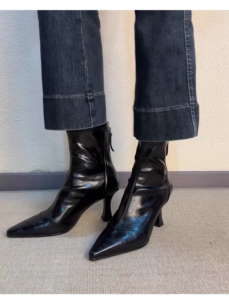 - Phiên bản da bò ~ Giày bốt ngắn mũi nhọn cao gót, bốt cao gót kiểu Pháp co giãn dành cho nữ, bốt da mềm đa năng có khóa kéo da thật kiểu dáng ôm sát