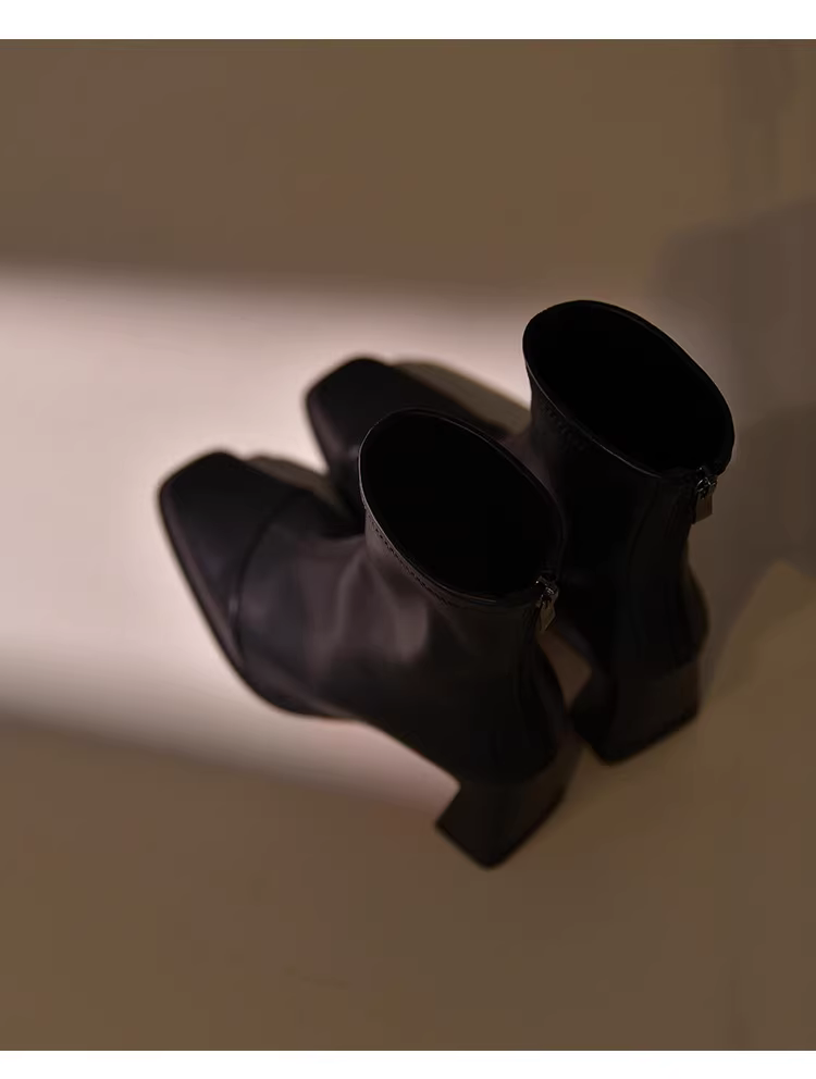 Phiên bản da bò ~ Giày bốt ngắn mũi vuông kiểu Pháp nhẹ nhàng, tôn dáng dành cho nữ có khóa kéo phía sau, giày bốt ôm dáng tối giản mũi vuông co giãn