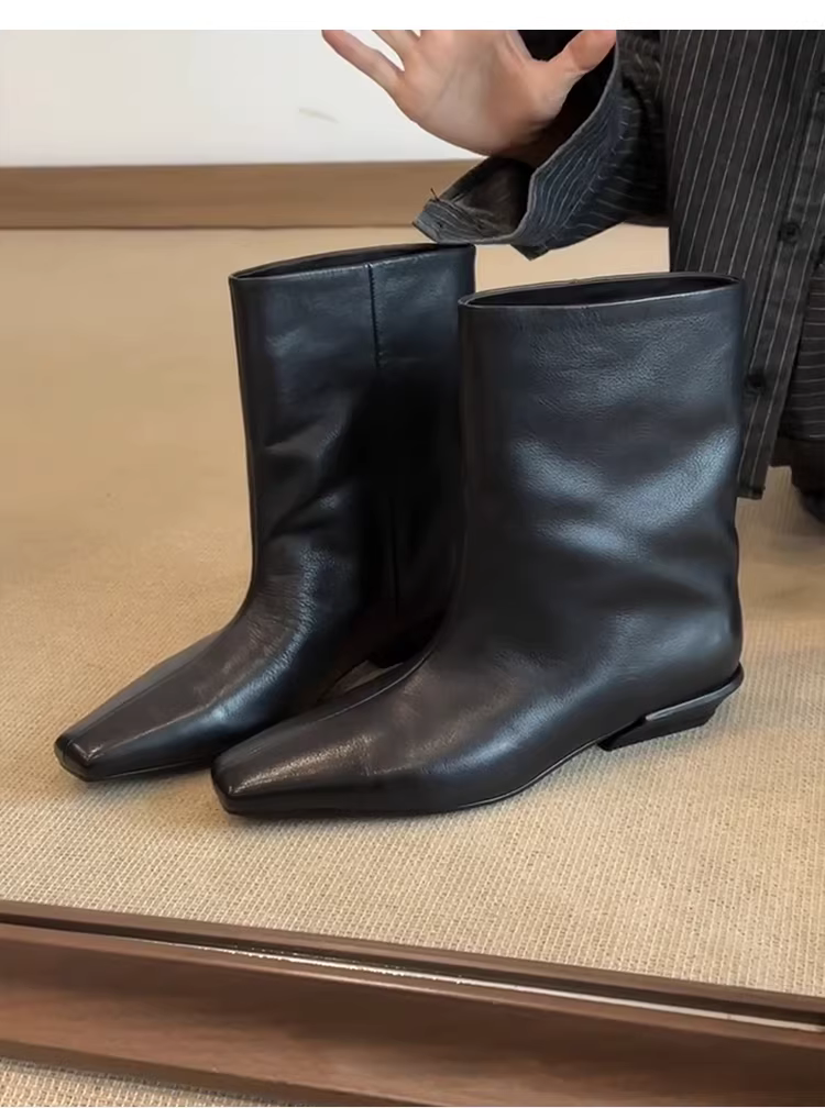 - Phiên bản da bò ~ Giày bốt ngắn ống rộng tối giản bằng da thật màu đen cổ điển dành cho nữ, giày bốt thời trang mũi vuông gót thấp kiểu dáng thời trang