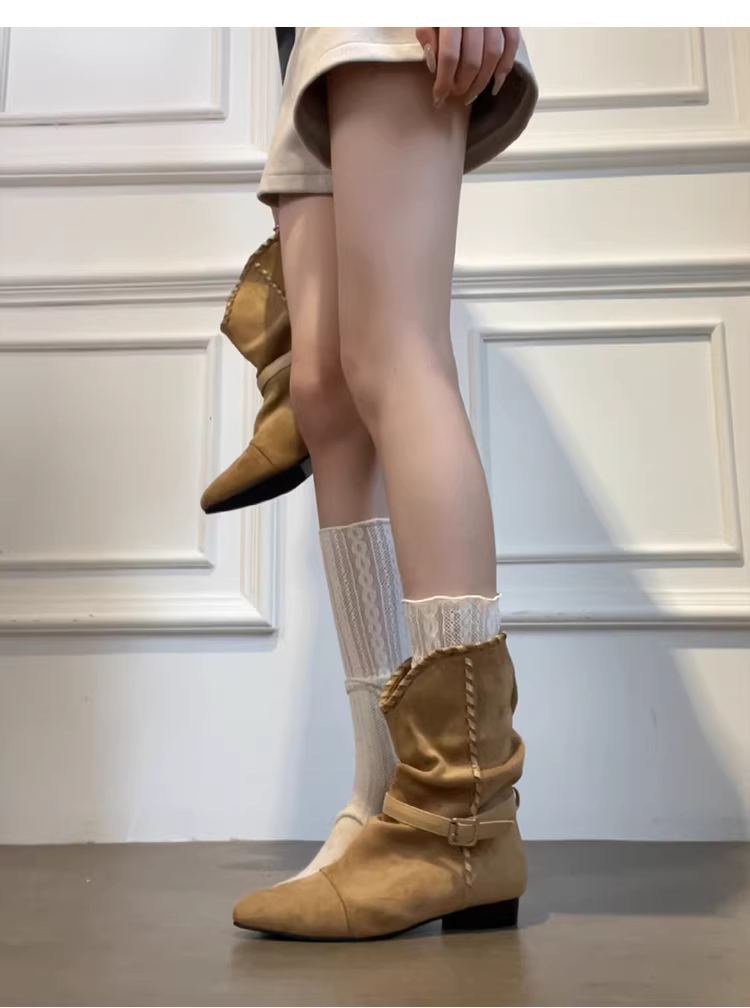- Phiên bản da bò ~ Giày bốt nữ kiểu dáng mùa thu đông mới, kiểu Hàn Quốc, khóa thắt lưng chữ V, đế bằng, chất liệu da lộn xếp ly, kiểu dáng chồng lớp