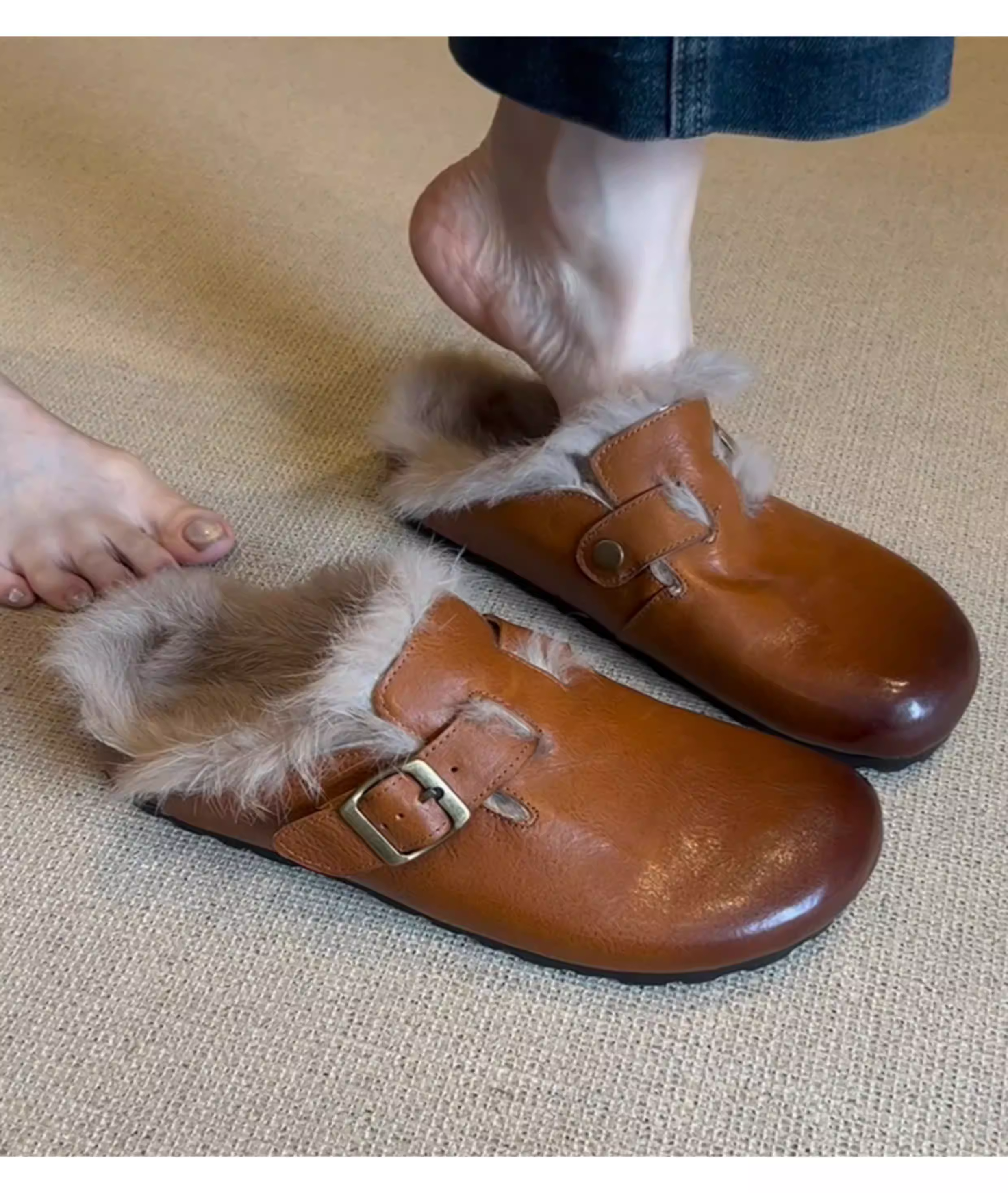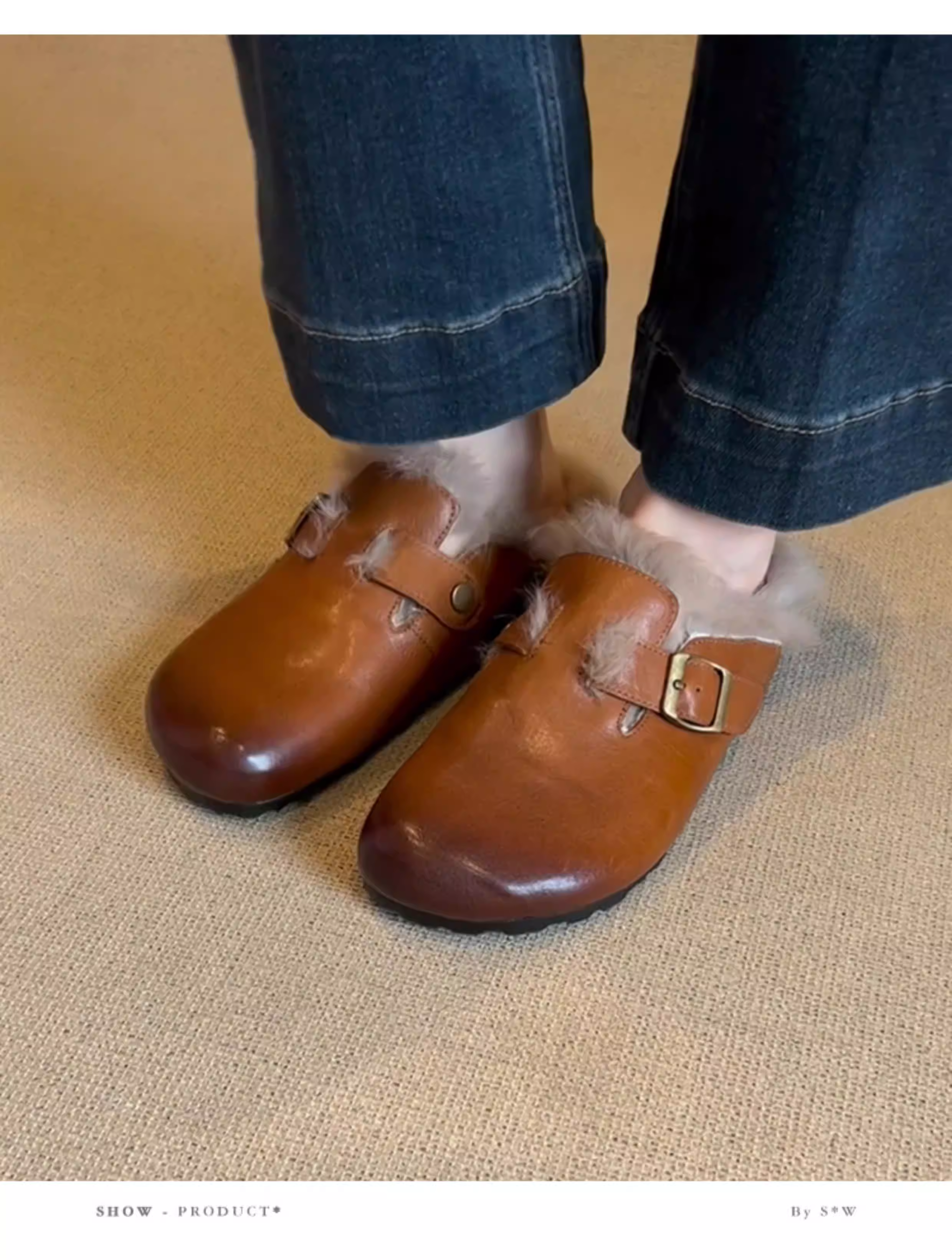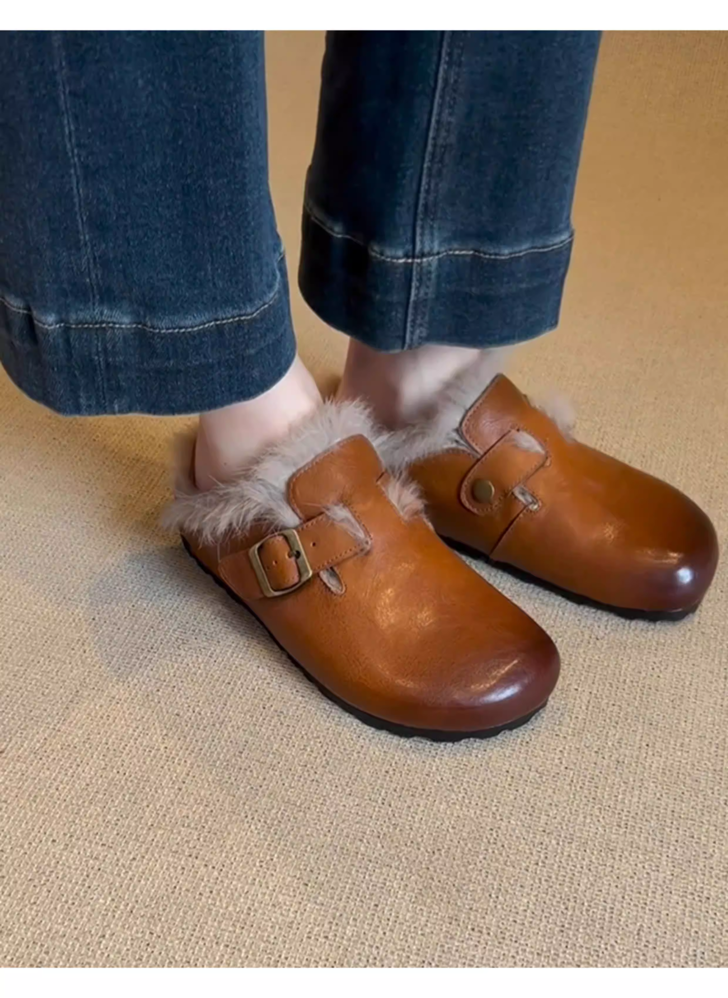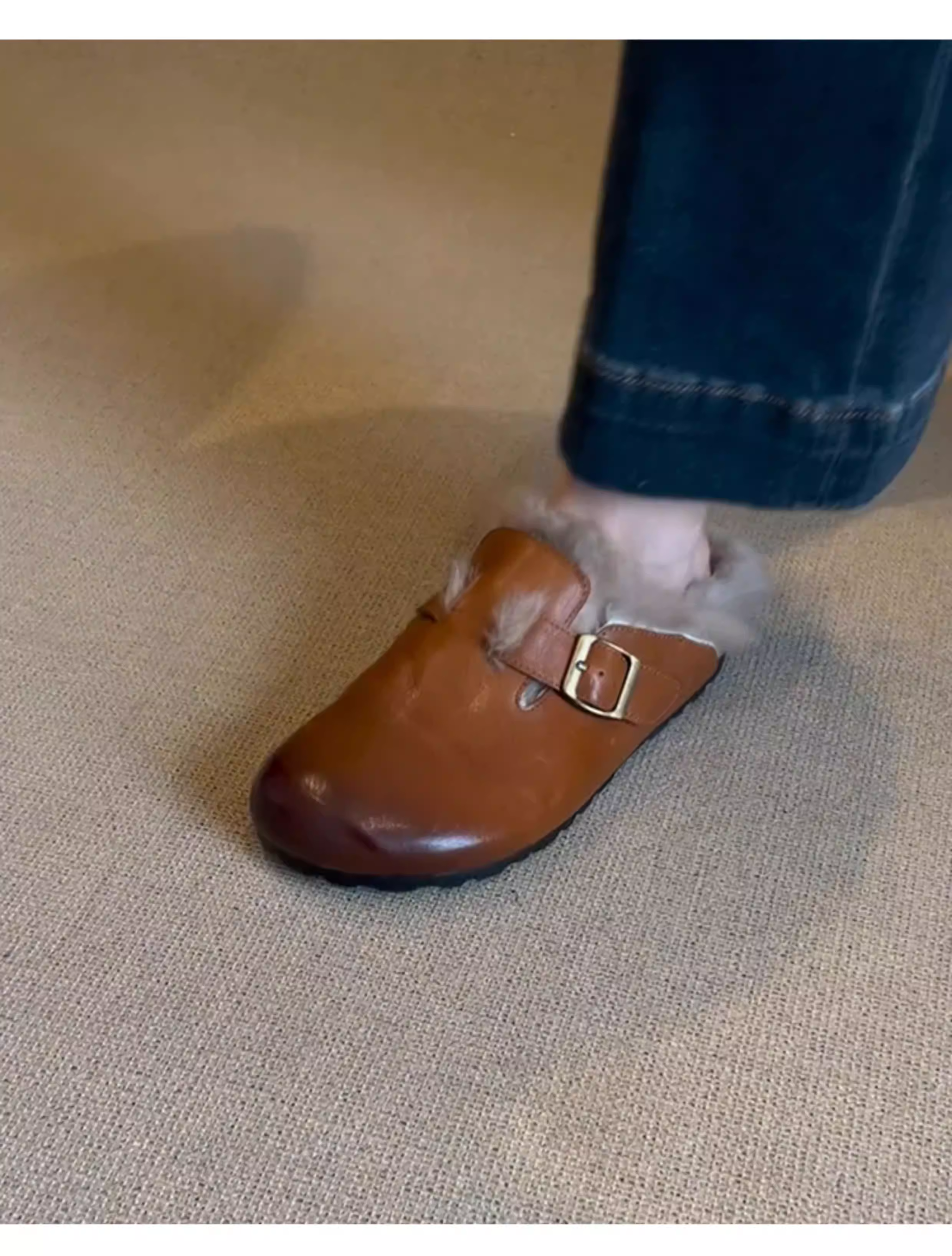 - Phiên bản da bò ~ Giày lông có mũi kín kiểu cổ điển dành cho nữ, da thật đế bằng có lông cừu, giày Birkenstock đơn giản kiểu lười đi làm.