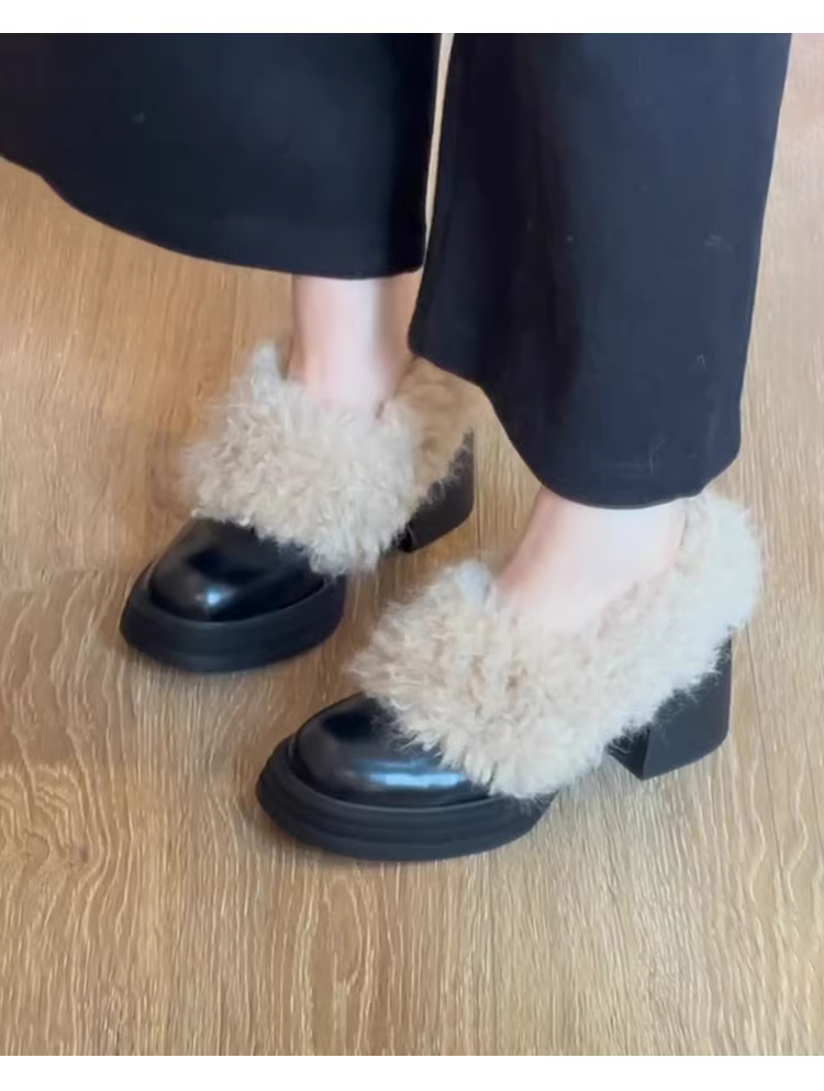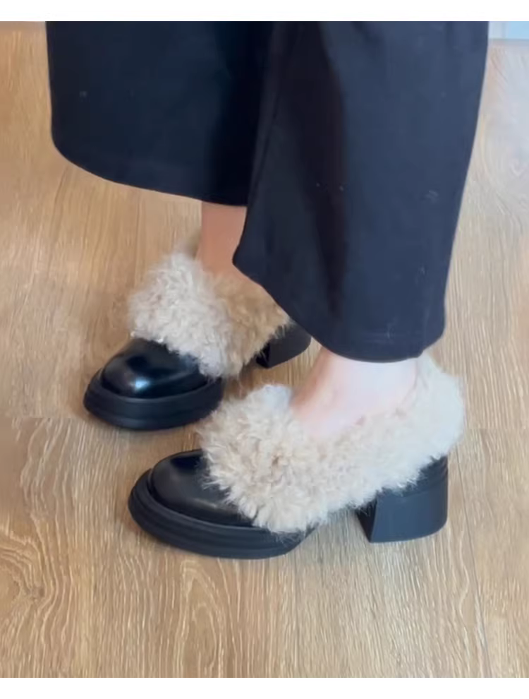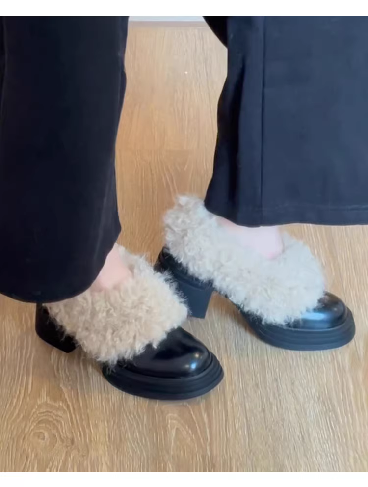 Phiên bản da bò ~ Giày lông đế dày dành cho nữ, giày lười da thật cổ điển, giày cao gót đa năng bằng len cừu, giày cotton ấm áp
