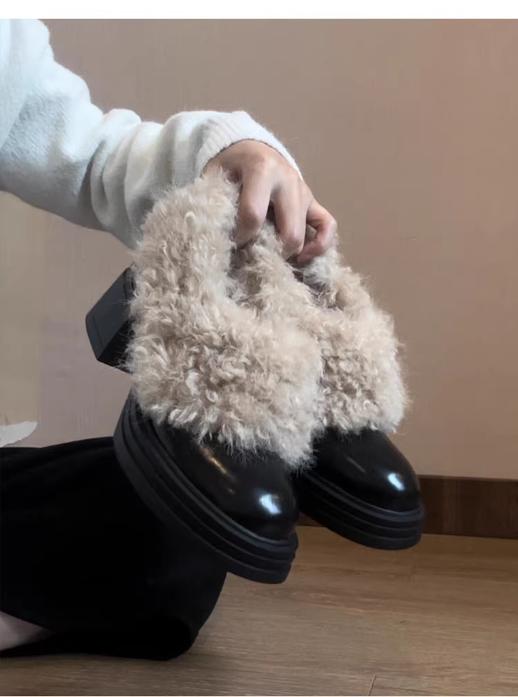 - Phiên bản da bò ~ Giày lông đế dày dành cho nữ, giày lười da thật cổ điển, giày cao gót đa năng bằng len cừu, giày cotton ấm áp