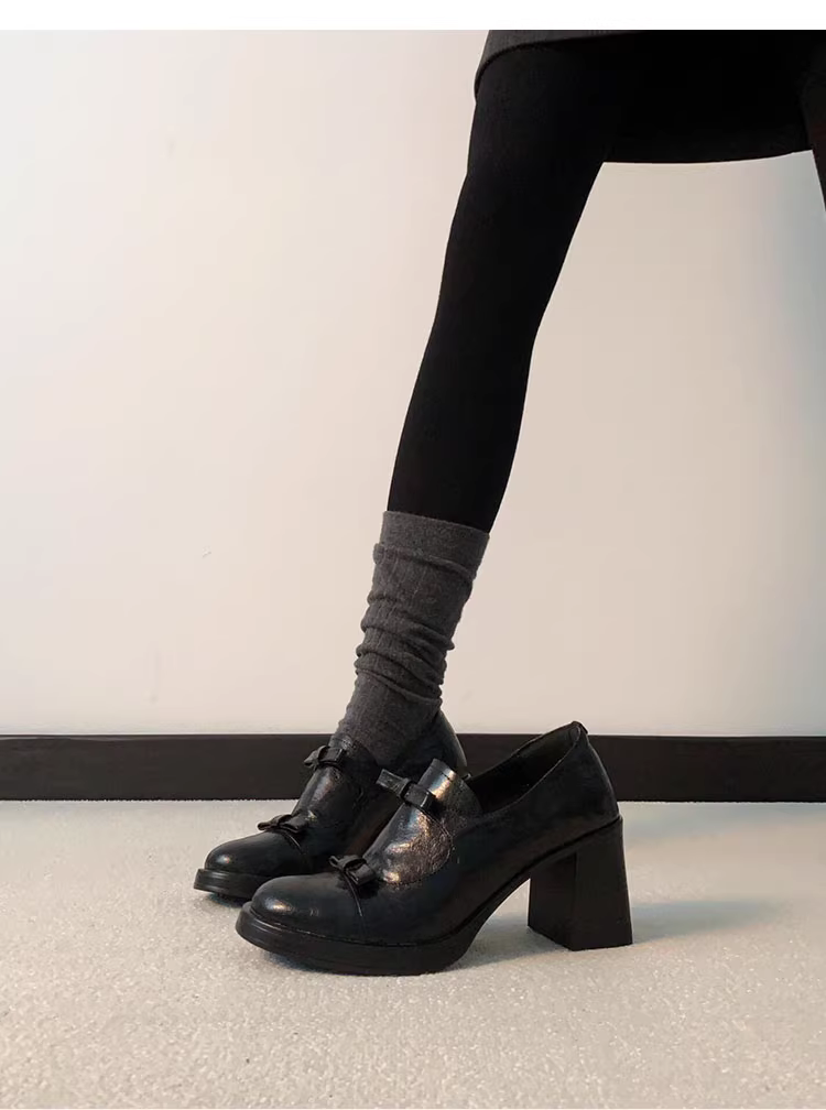 Phiên bản da bò~ Giày lười kiểu ba lê Anh Quốc dành cho nữ với kiểu dáng xẻ sâu, có nơ, da thật, giày cao gót, kiểu lười đi dễ dàng