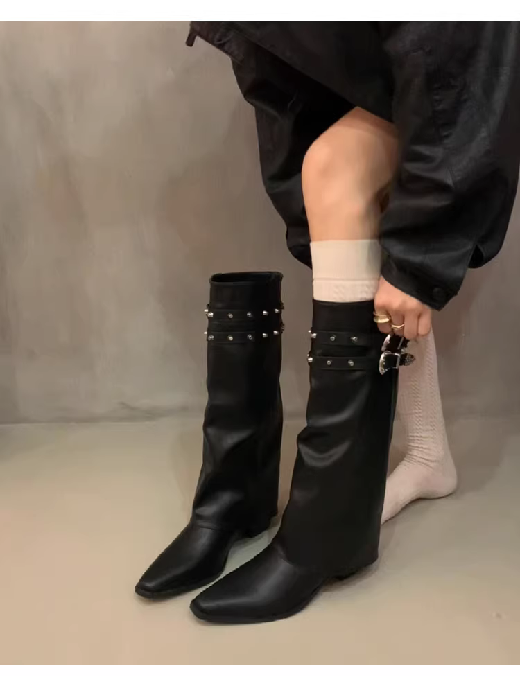 - Phiên bản da bò ~ Quần bó sát có khóa thắt lưng đính đá thời trang, ủng mũi nhọn gót thô da thật cổ điển, ủng dài nữ, ủng cưỡi ngựa