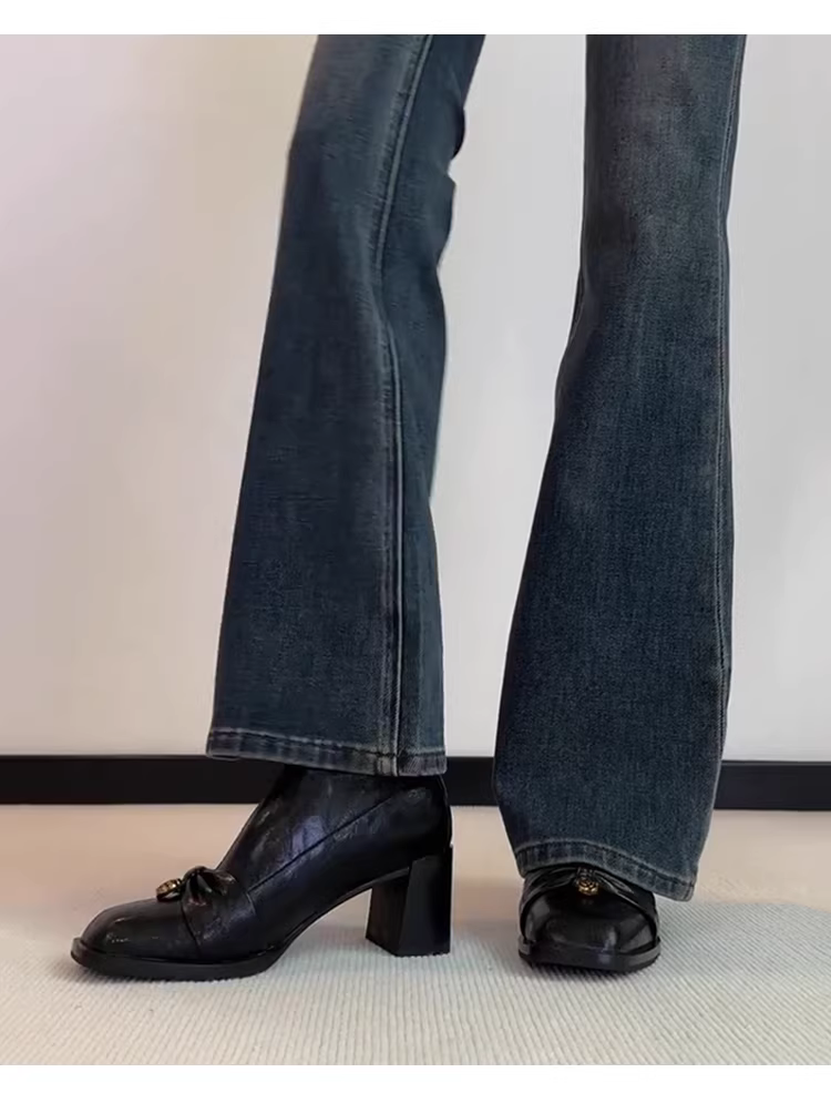 - Phiên bản da bò~Giày bốt cao gót kiểu cổ điển thời trang dành cho nữ có khóa kéo phía sau, mũi vuông, giày bốt ngắn nơ hoa trà thanh lịch