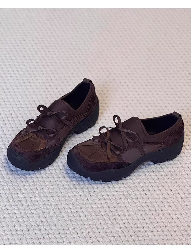 Phiên bản da bò~Giày lười cổ điển kiểu ballet dành cho nữ, giày thể thao đế dày có nơ bằng da lộn kiểu dáng thể thao đế dày