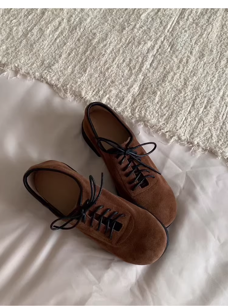 - Phiên bản da cừu ~ 24 đôi giày đế bằng da thật phong cách retro mới của Hàn Quốc có dây buộc mũi tròn màu nâu dành cho nữ