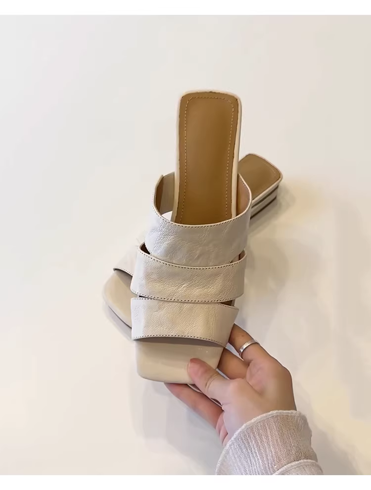 Phiên bản da cừu ~ Dép hở mũi vuông cổ điển đơn giản dành cho nữ, gót dày bằng da thật đa năng, giày lười kiểu La Mã thoải mái