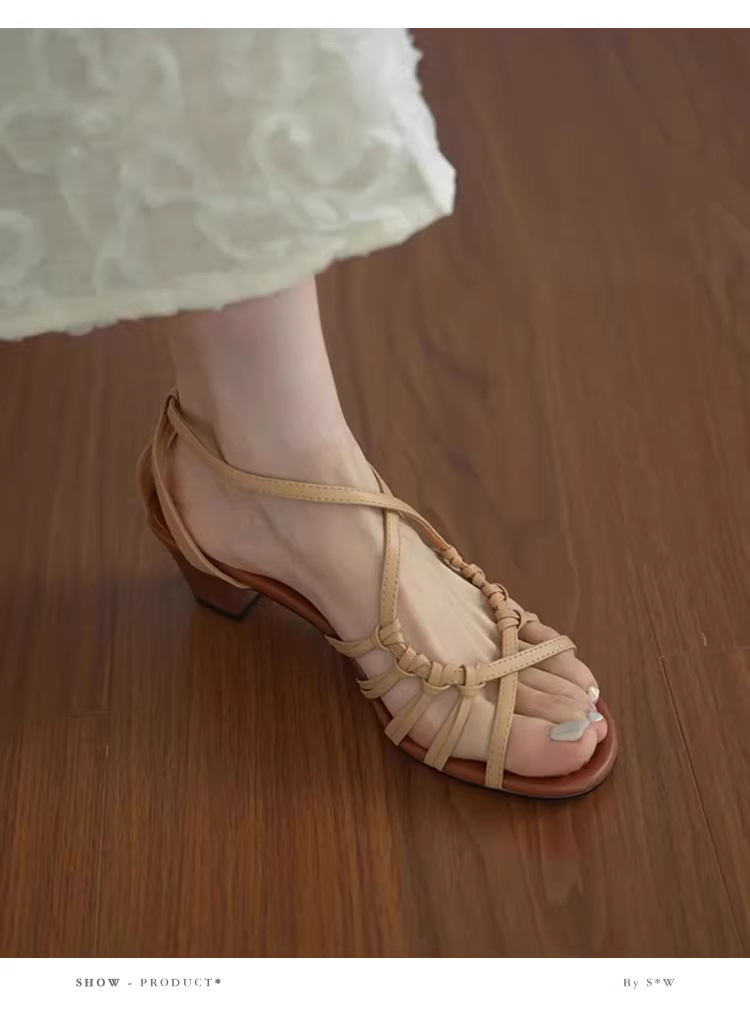 Phiên bản da cừu ~ Dép La Mã cao gót kiểu nghỉ dưỡng, dệt tay, khoét lỗ, dành cho nữ, dép quai ngang mùa hè thanh lịch, phối đồ đi cùng đầm