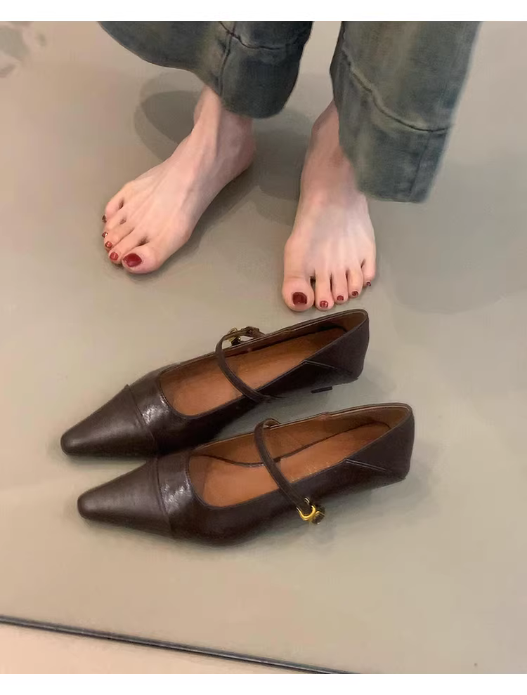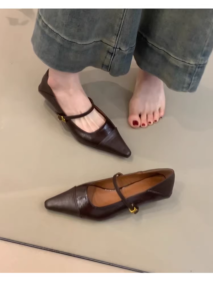 Phiên bản da cừu ~ Giày bệt mũi nhọn cao cấp, gót thấp thanh lịch dành cho nữ, giày Mary Jane cổ thấp bằng da thật, kiểu retro có dây quai mắt cá chân