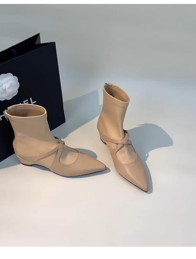 Phiên bản da cừu ~ Giày bốt da thật mũi nhọn có dây đeo chéo kiểu Pháp dành cho nữ, thanh lịch và dịu dàng, gót dày, bốt ngắn có khóa kéo phía sau