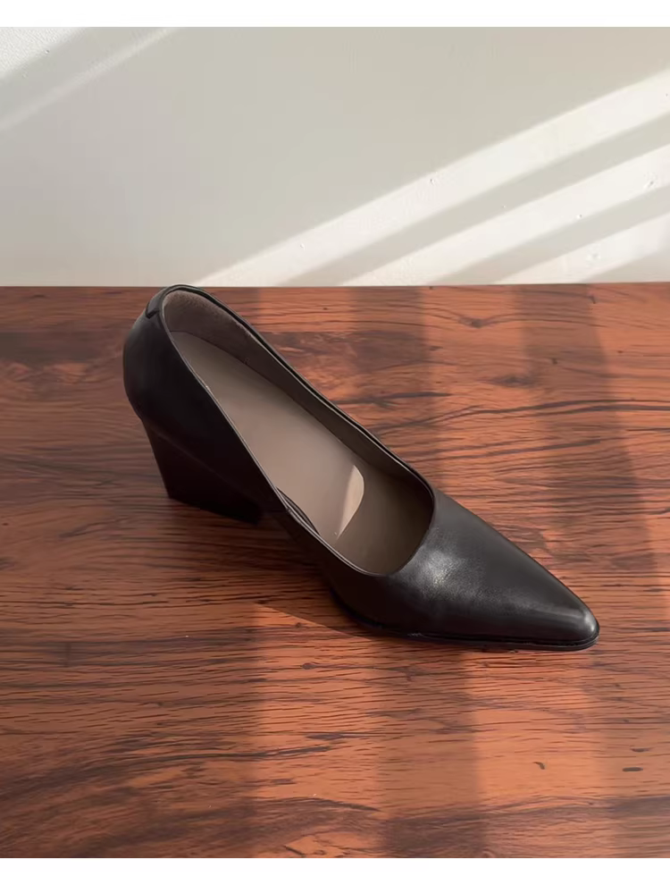- Phiên bản da cừu ~ Giày cao gót cổ điển dành cho nữ, mũi nhọn, giày đế bằng đa năng, miệng nông, gót dày, giày cổ điển bằng da thật