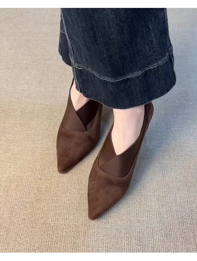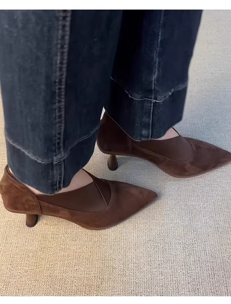 - Phiên bản da cừu ~ Giày cao gót da lộn kiểu dáng xỏ ngón, kiểu chữ V dành cho nữ, đa năng cho mùa thu, đi làm, giày da thật mũi nhọn