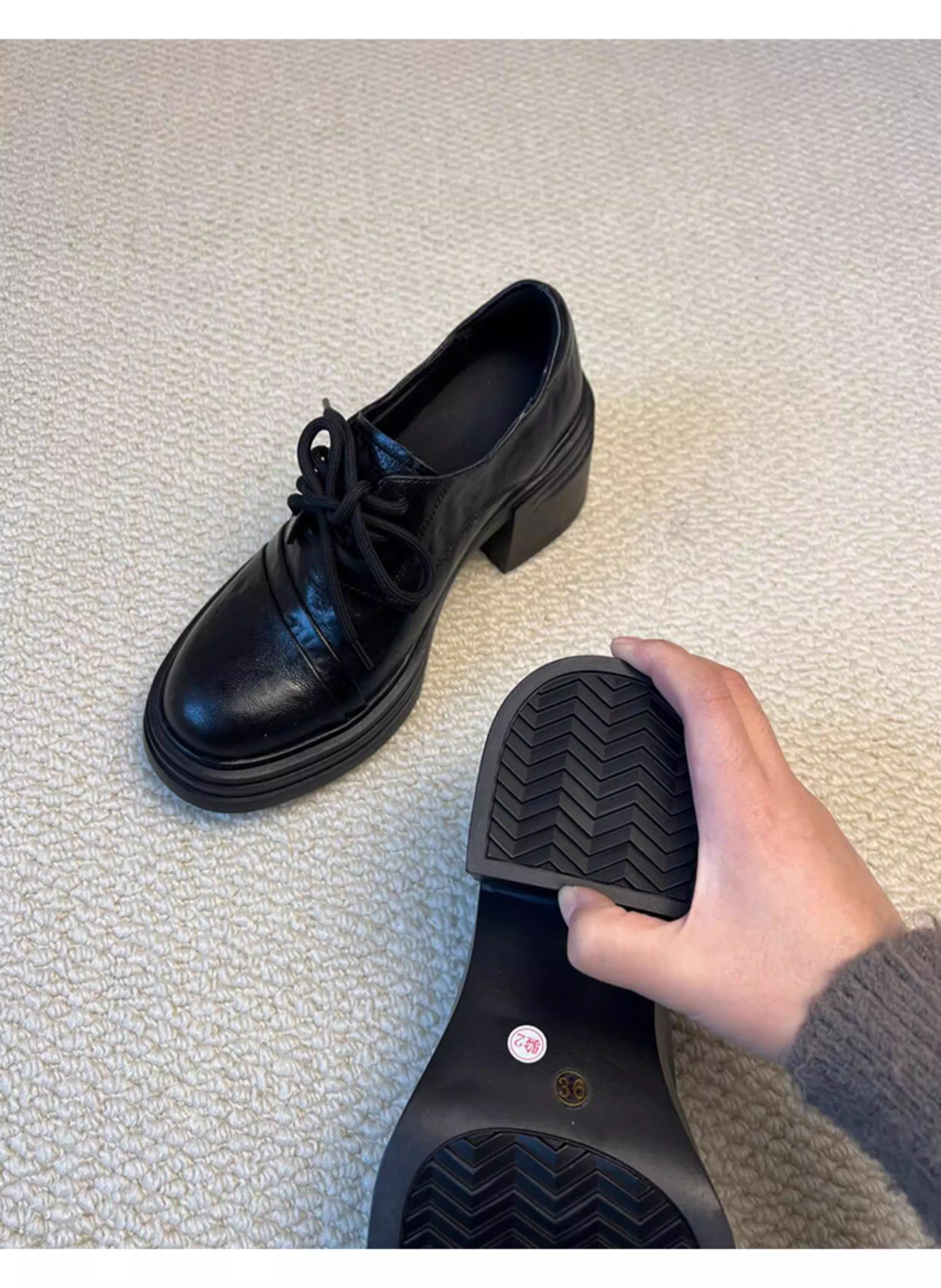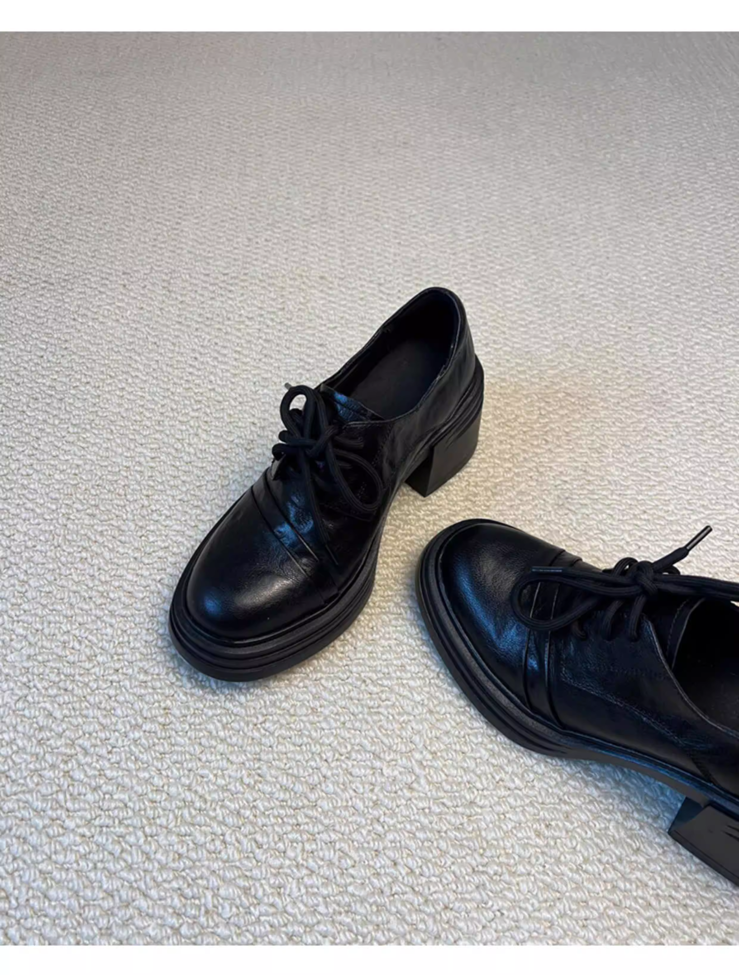- Phiên bản da cừu ~ Giày cao gót đi làm dành cho nữ, giày lười mũi tròn bằng da thật có dây buộc, giày đế dày chống thấm nước kiểu retro.
