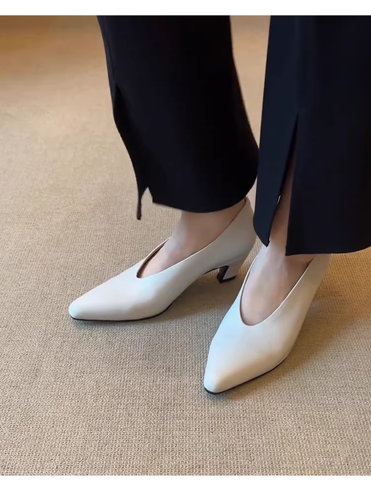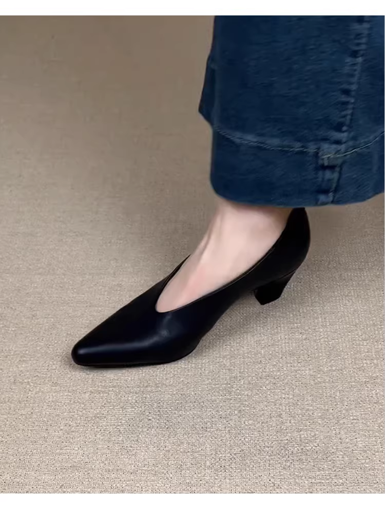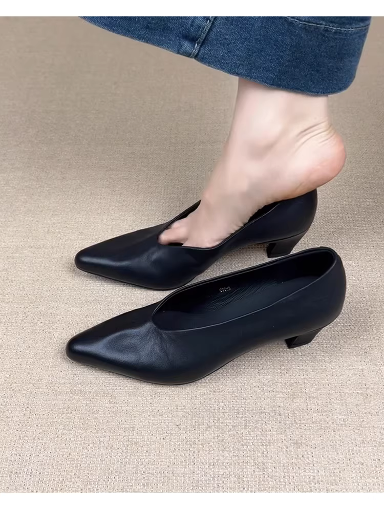 - Phiên bản da cừu ~ Giày cao gót mũi nhọn kiểu lười dành cho nữ, giày đơn da thật đa năng, miệng nông, kiểu cổ điển tối giản, giày gót thô kiểu phù thủy.