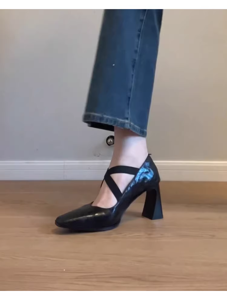 Phiên bản da cừu ~ Giày cao gót thanh lịch dành cho nữ có quai chéo, mũi vuông, giày Mary Jane cổ điển kiểu dáng cổ điển bằng da thật.