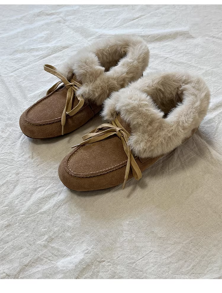 Phiên bản da cừu ~ Giày cotton ấm áp thời trang dành cho nữ, giày lười buộc dây nơ, giày lười đế bằng da lộn có lông
