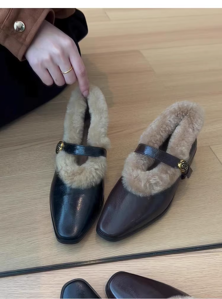 - Phiên bản da cừu ~ giày cotton đế thấp có lớp lót lông cừu giữ ấm, giày đế thấp, mũi vuông, giày Mary Jane da thật có quai đơn.