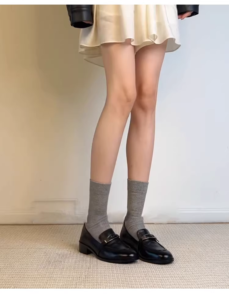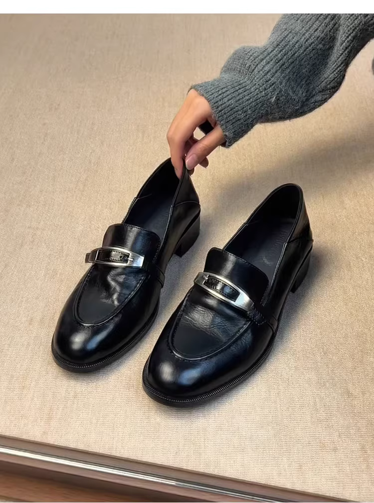 - Phiên bản da cừu ~ Giày da có khóa kim loại thời trang kiểu retro dành cho nữ, giày lười da thật màu đen phong cách Anh quốc