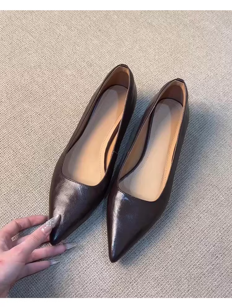 Phiên bản da cừu ~ Giày da đế thấp đi làm mũi nhọn, giày công sở thanh lịch, giày nữ kiểu dáng cổ điển, mũi nông, kiểu lười