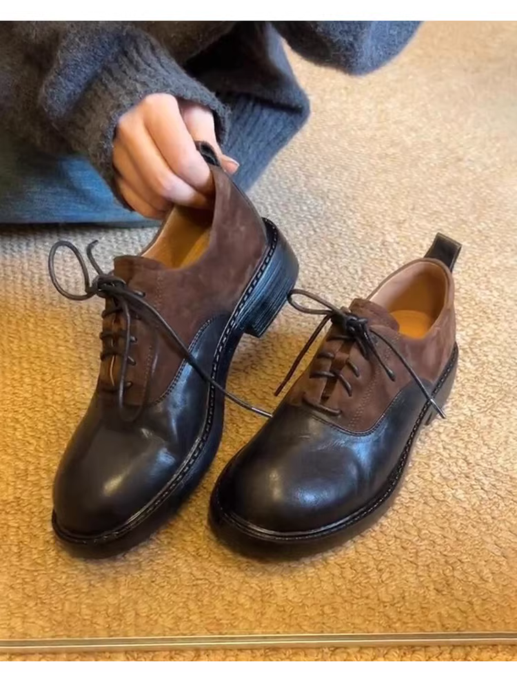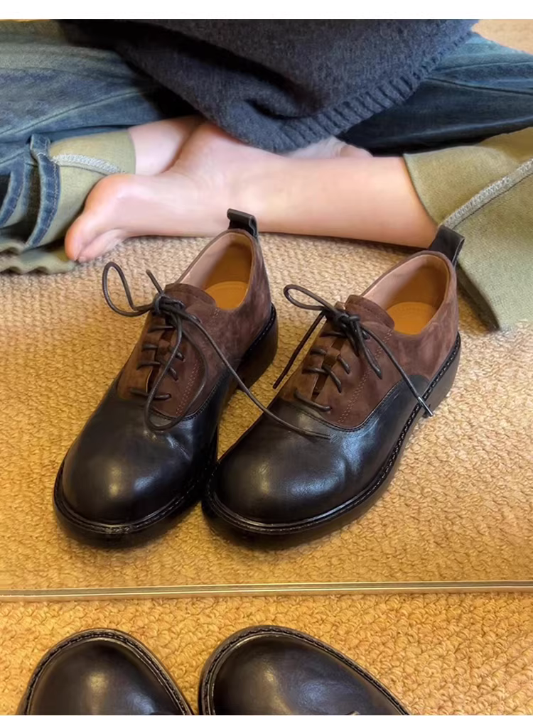 - Phiên bản da cừu~ Giày da nữ đế thấp kiểu retro phối da lộn kiểu nhà kho, mũi tròn, buộc dây, chất liệu da thật.