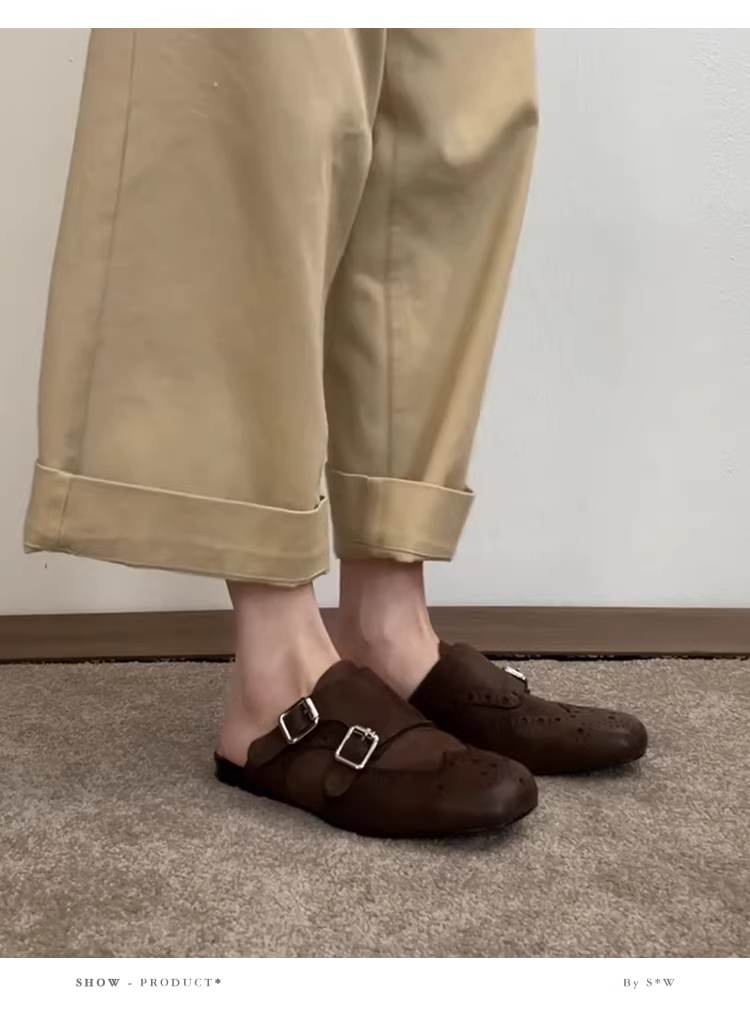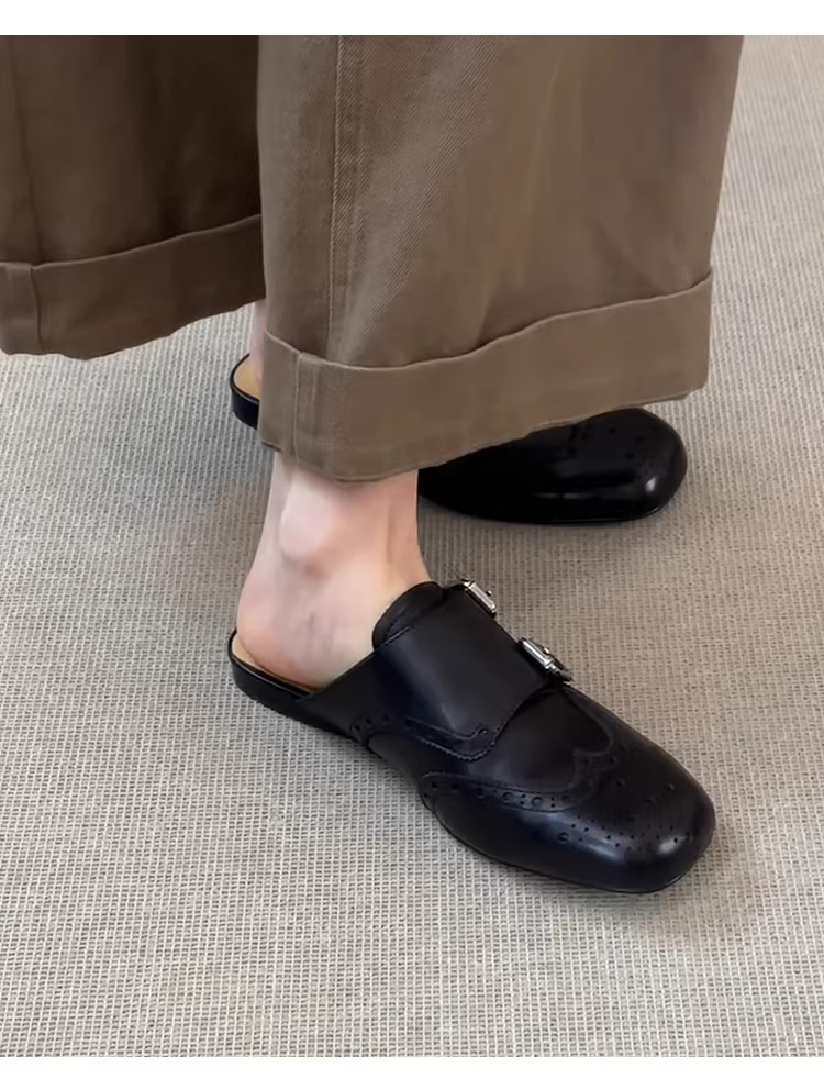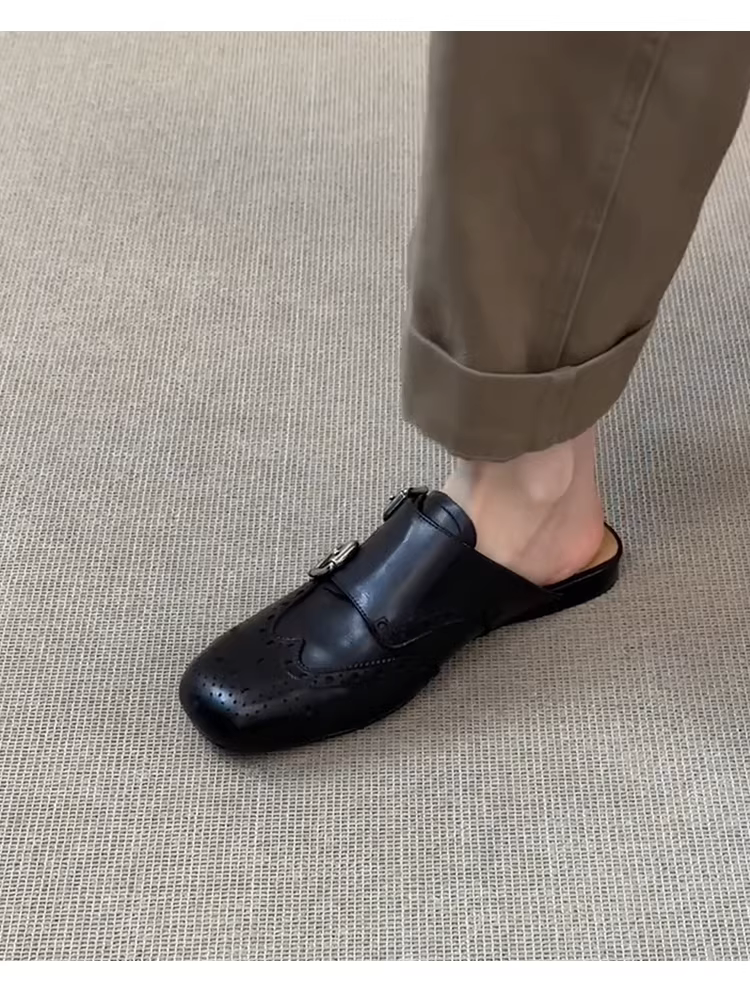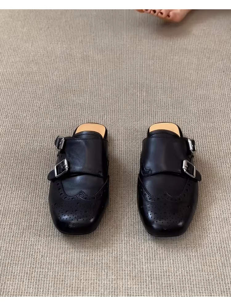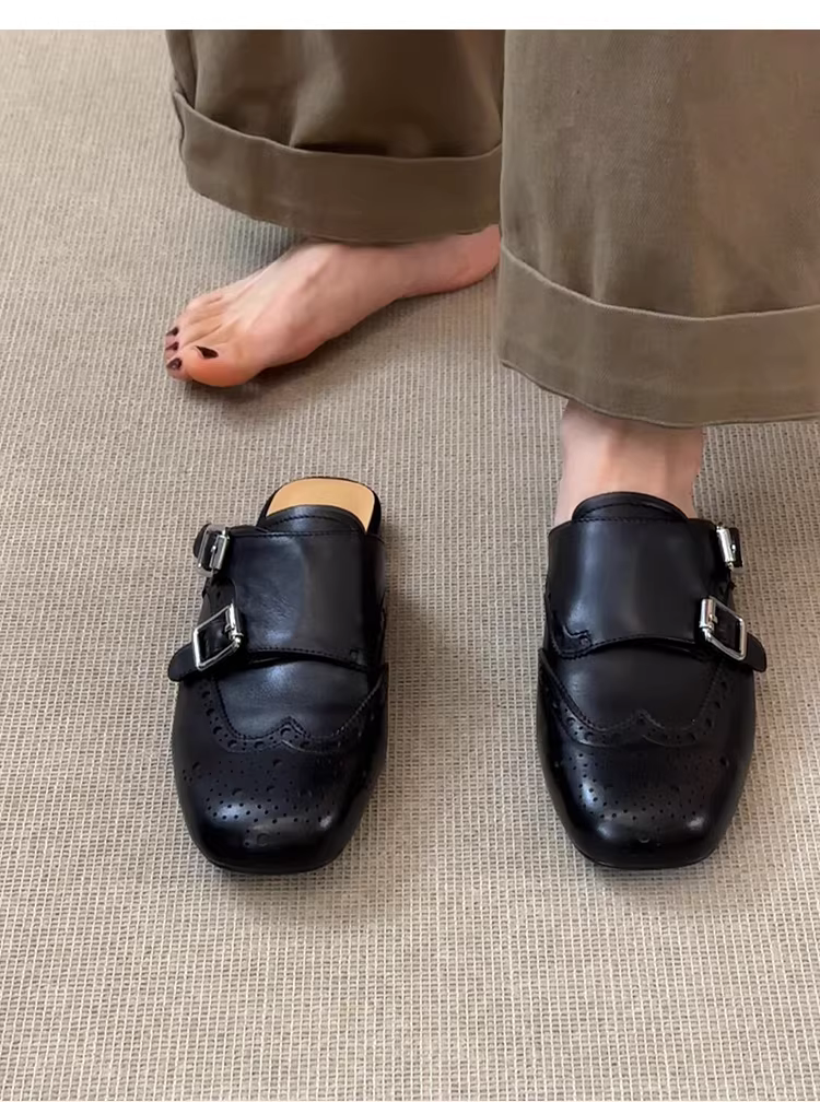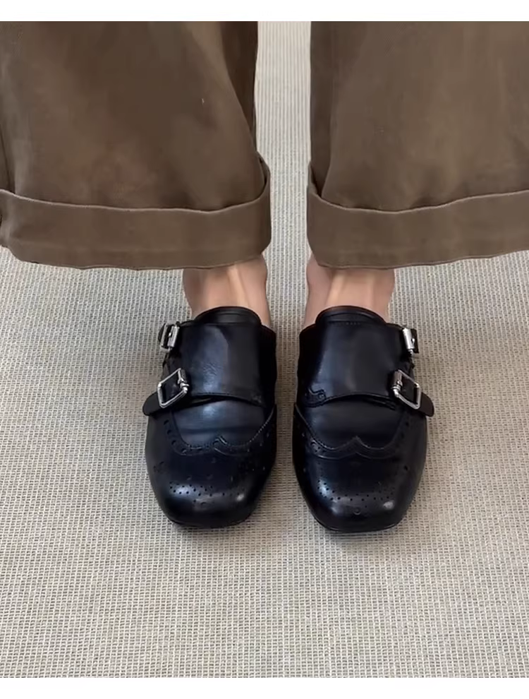 - Phiên bản da cừu ~ Giày da thật màu đen có mũi kín, kiểu dáng cổ điển, đa năng, mũi vuông, kiểu brogue nửa dép dành cho nữ