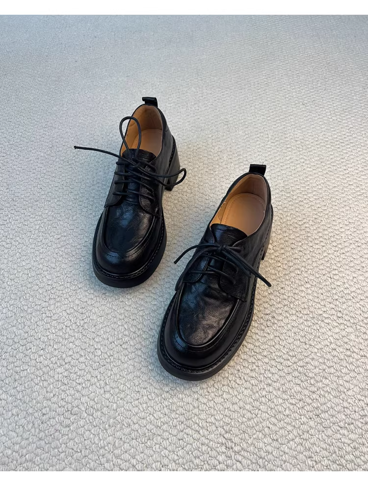 Phiên bản da cừu ~ Giày đế dày buộc dây kiểu đại học dành cho nữ, giày da thật đa năng đế dày, phong cách Anh quốc, giày da nhỏ kiểu giản dị
