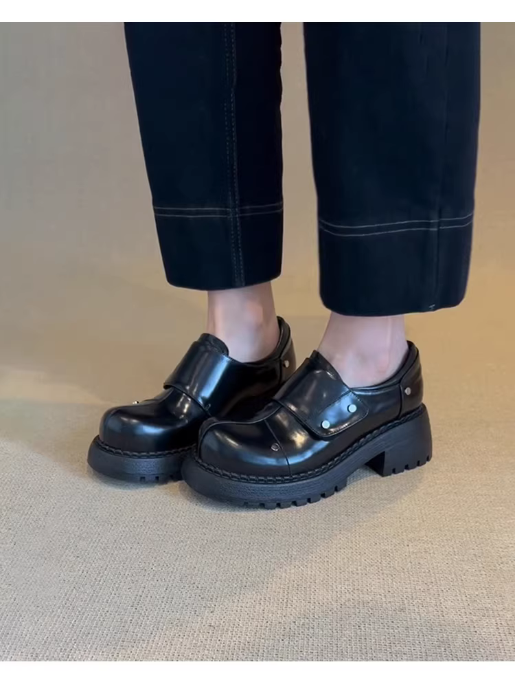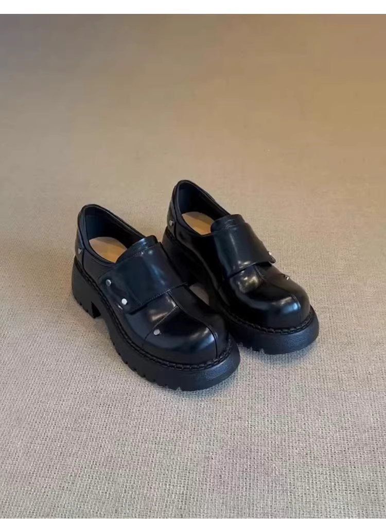 Phiên bản da cừu ~ Giày derby đế dày có khóa dán dành cho nữ, giày da thật đính đinh tán kiểu Anh cao cấp, giày da nhỏ kiểu Anh cao cấp