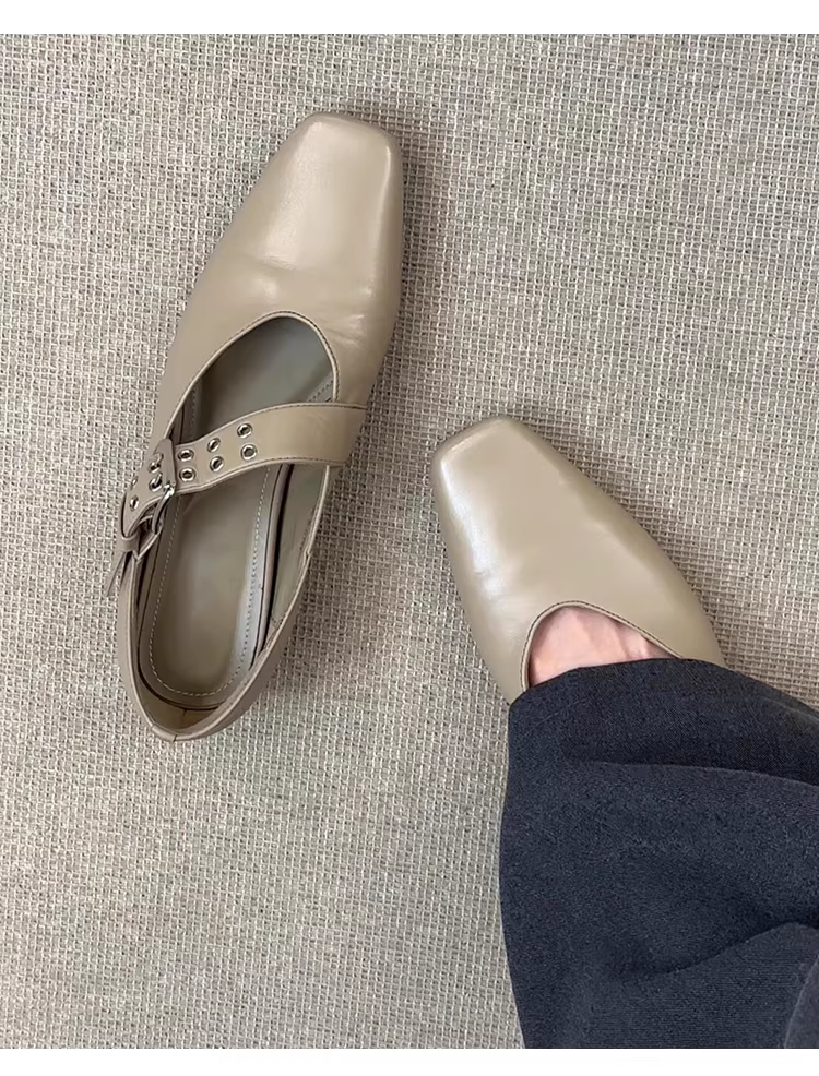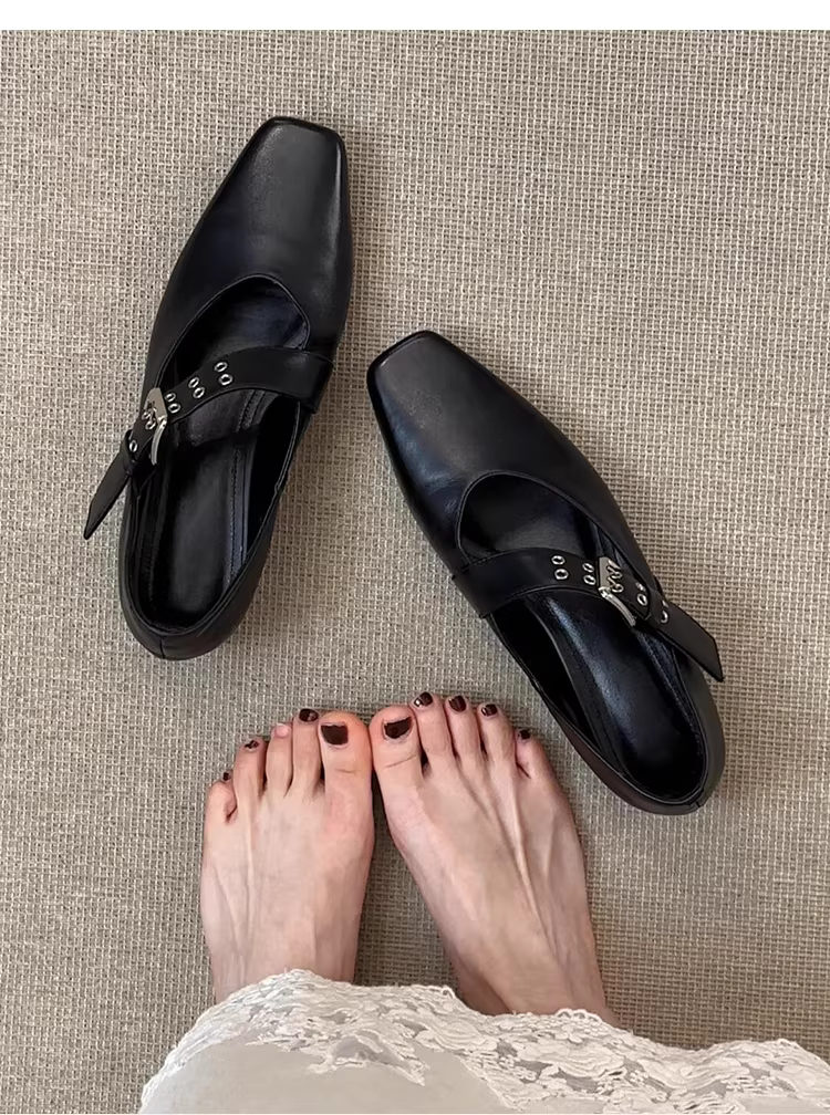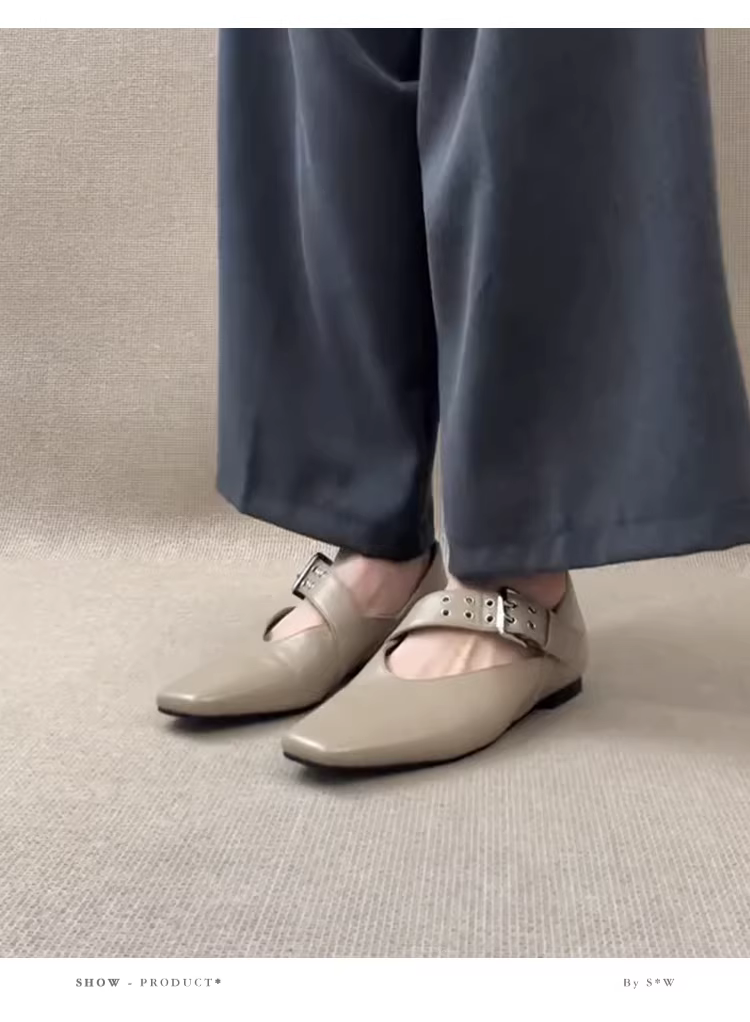 Phiên bản da cừu ~ Giày đi làm đế phẳng đa năng dành cho nữ có khóa thắt lưng, giày da nhỏ kiểu cổ điển, mũi vuông, giày Mary Jane độc đáo