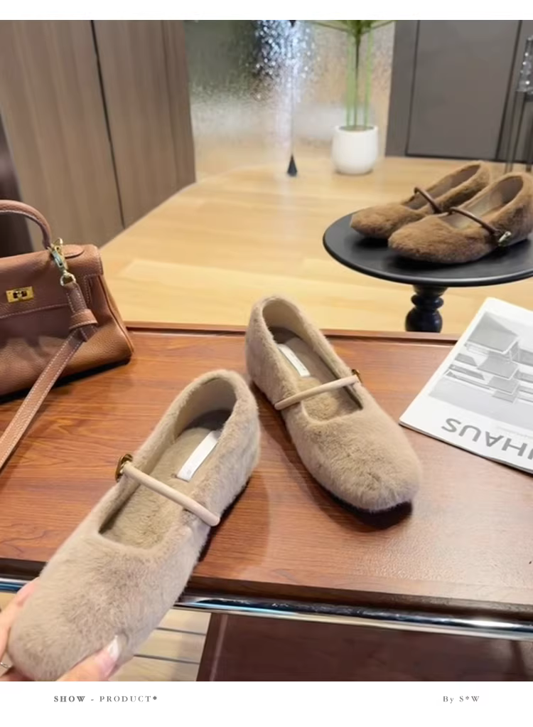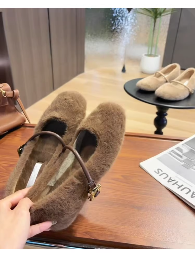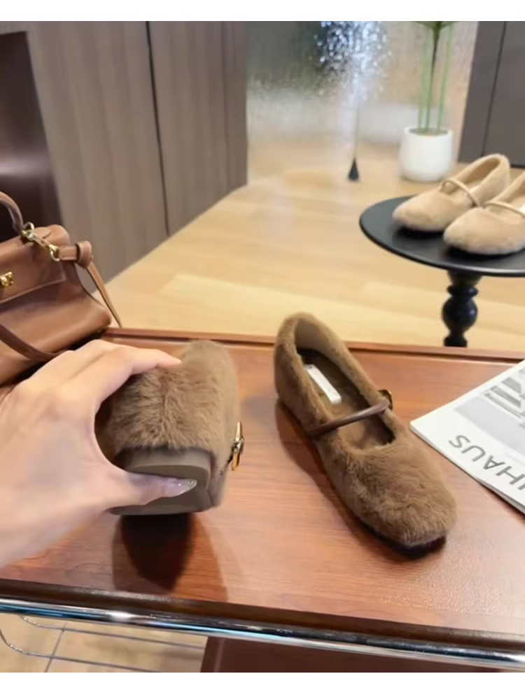 Phiên bản da cừu ~ Giày đơn đế thấp, ấm áp, tăng chiều cao dành cho nữ, kiểu Chanel, đa năng, giày lông mềm mại.