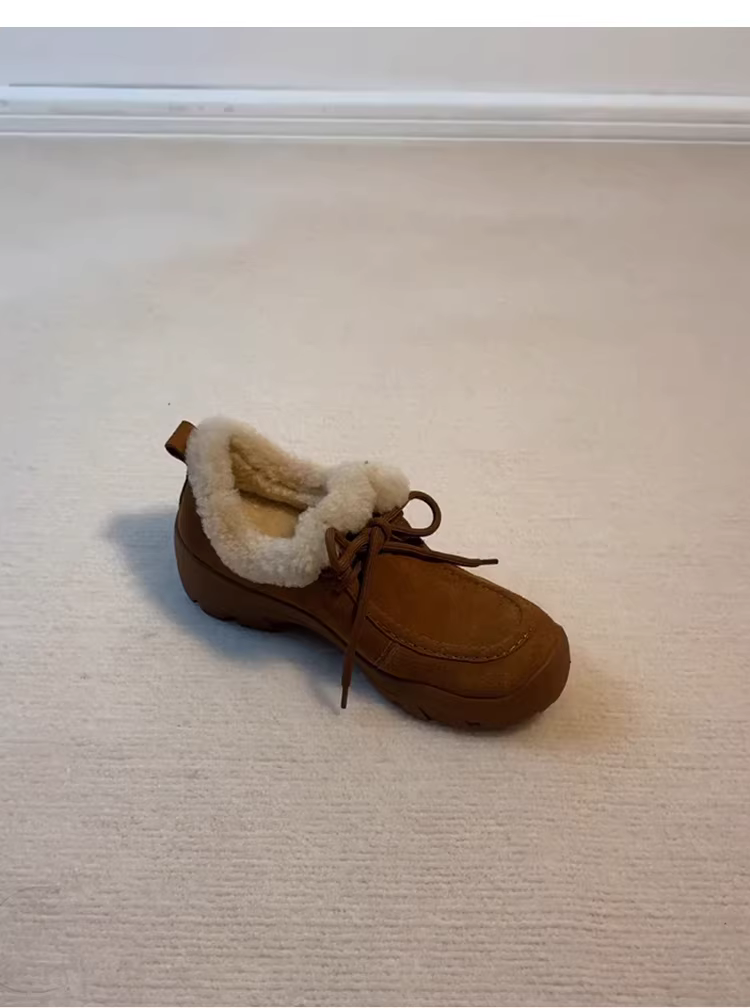 - Phiên bản da cừu ~ Giày lông cừu đế dày bằng da lộn thời trang mùa đông dành cho nữ, giày lười đi làm đơn giản có dây buộc lót lông cừu