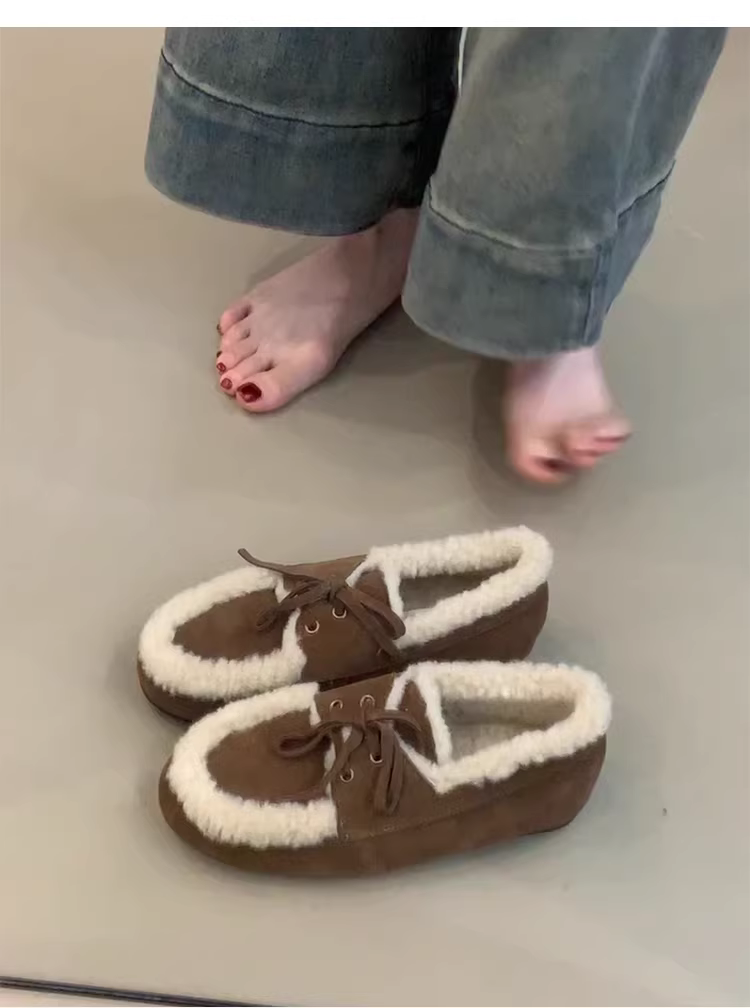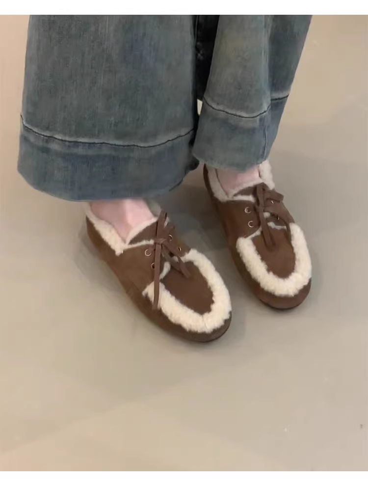 Phiên bản da cừu ~ Giày lười buộc dây ấm áp lót lông cừu dành cho nữ, giày đế bằng da lộn kiểu cổ điển, giày lông thú đa năng, giày cotton.