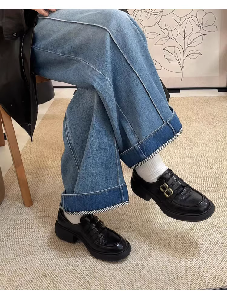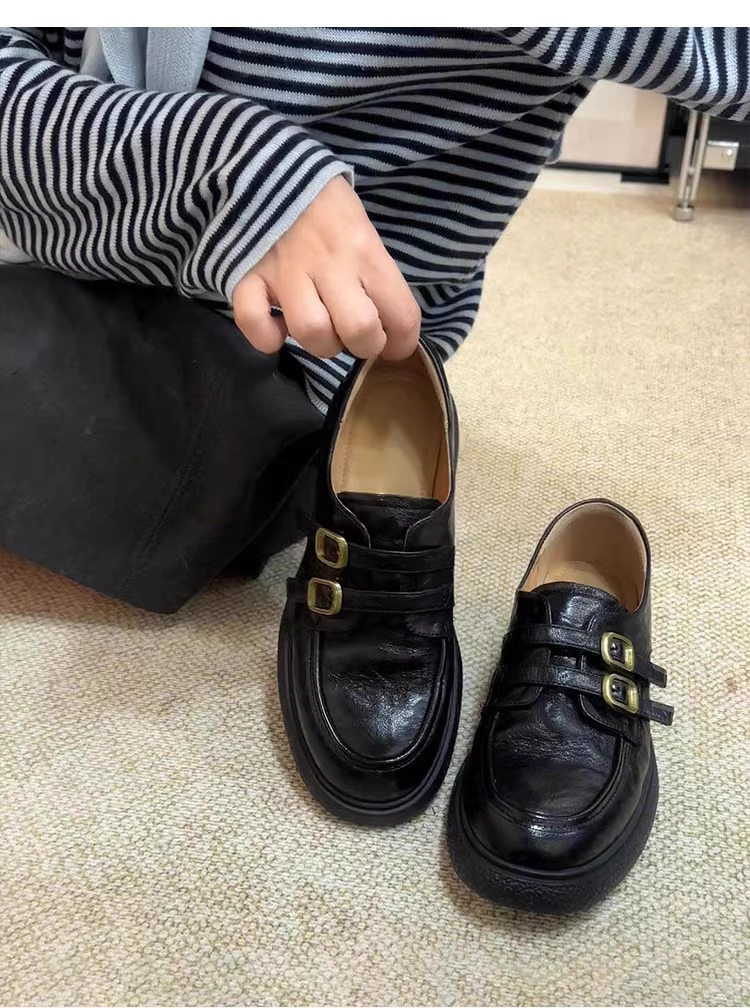 Phiên bản da cừu ~ Giày lười có dây đeo đôi Velcro kiểu đại học dành cho nữ, giày đế bệt gót vuông màu đen cổ điển