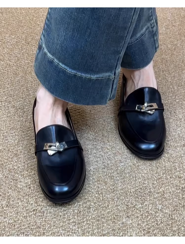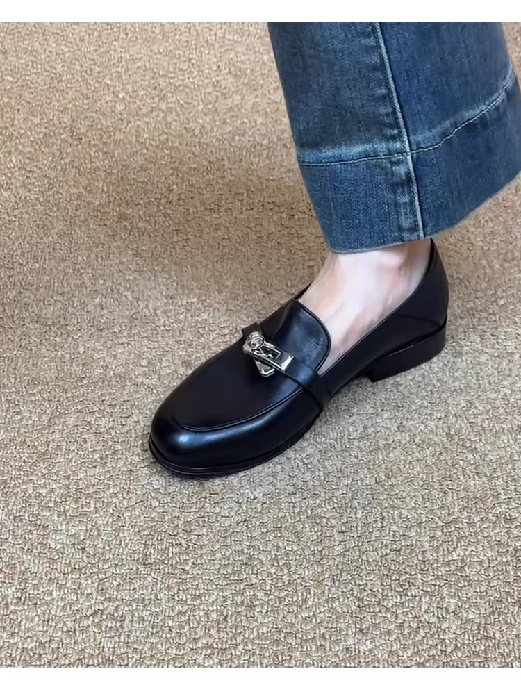 Phiên bản da cừu ~ giày lười có khóa kim loại cổ điển dành cho nữ mũi tròn bằng da thật được đánh bóng giày da đế bằng