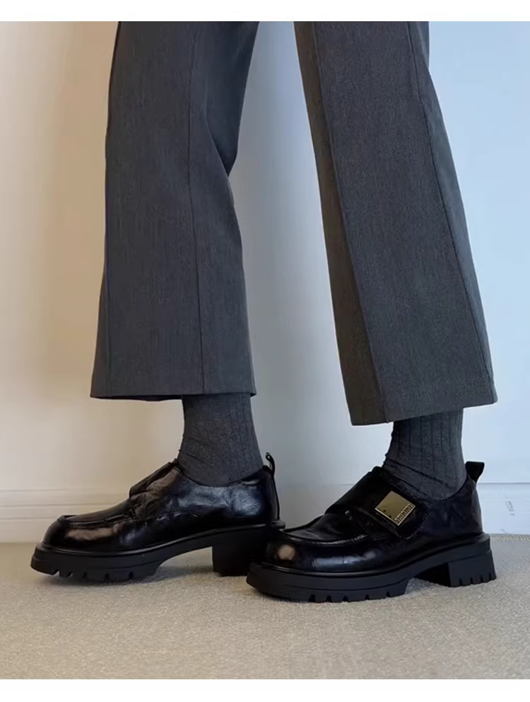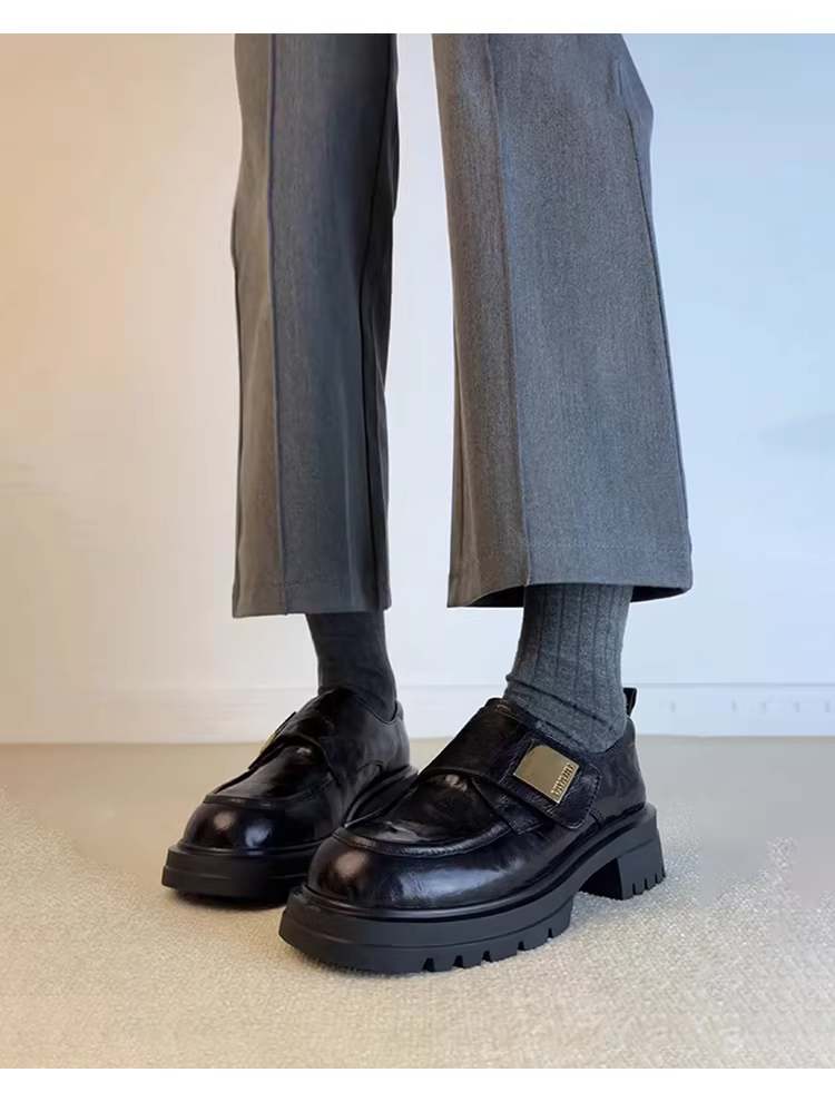 - Phiên bản da cừu ~ Giày lười có khóa kim loại Velcro kiểu Anh Giày da đế dày kiểu Anh Giày da đế dày kiểu retro dành cho nữ