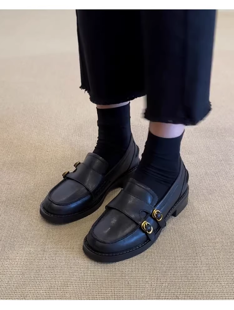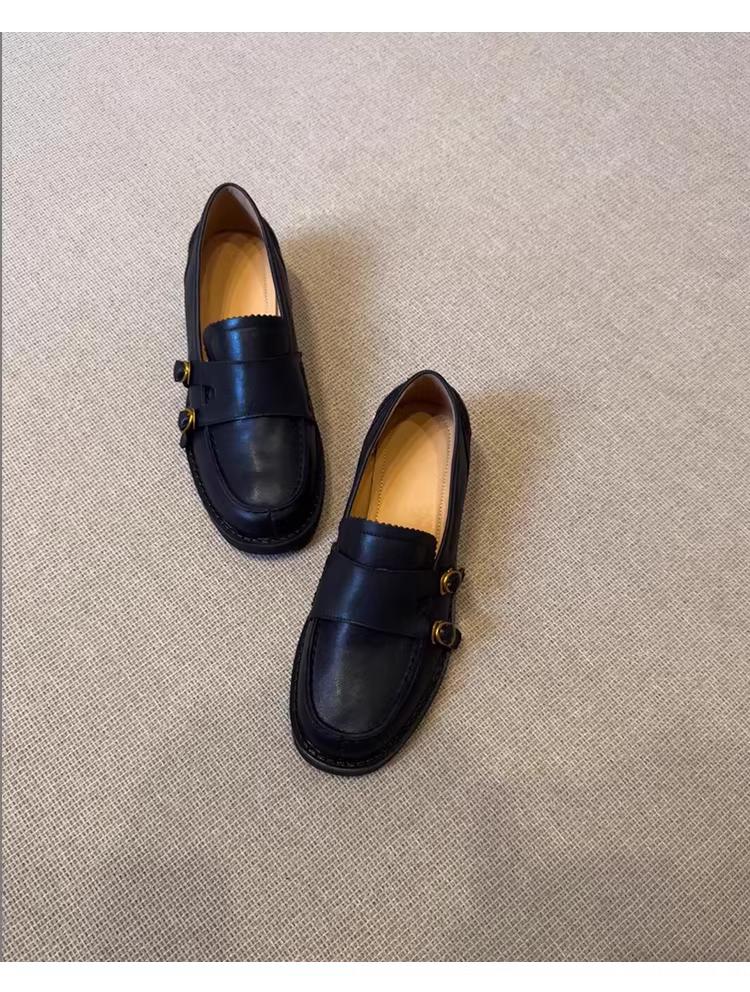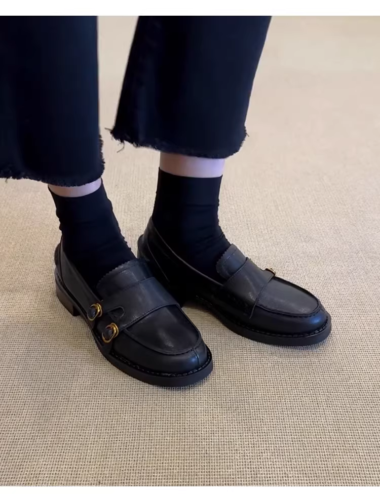 - Phiên bản da cừu ~ Giày lười đa năng đế thấp kiểu retro mới dành cho nữ, giày lười da thật mũi tròn hai hàng khuy