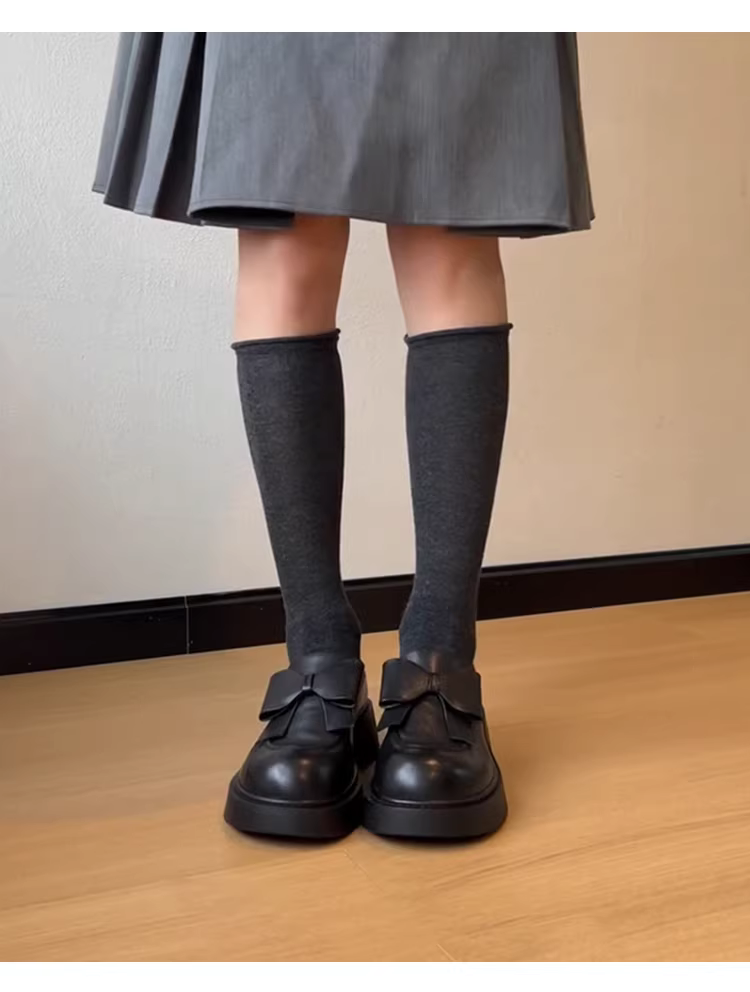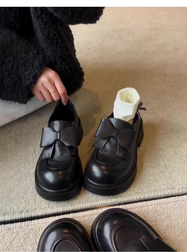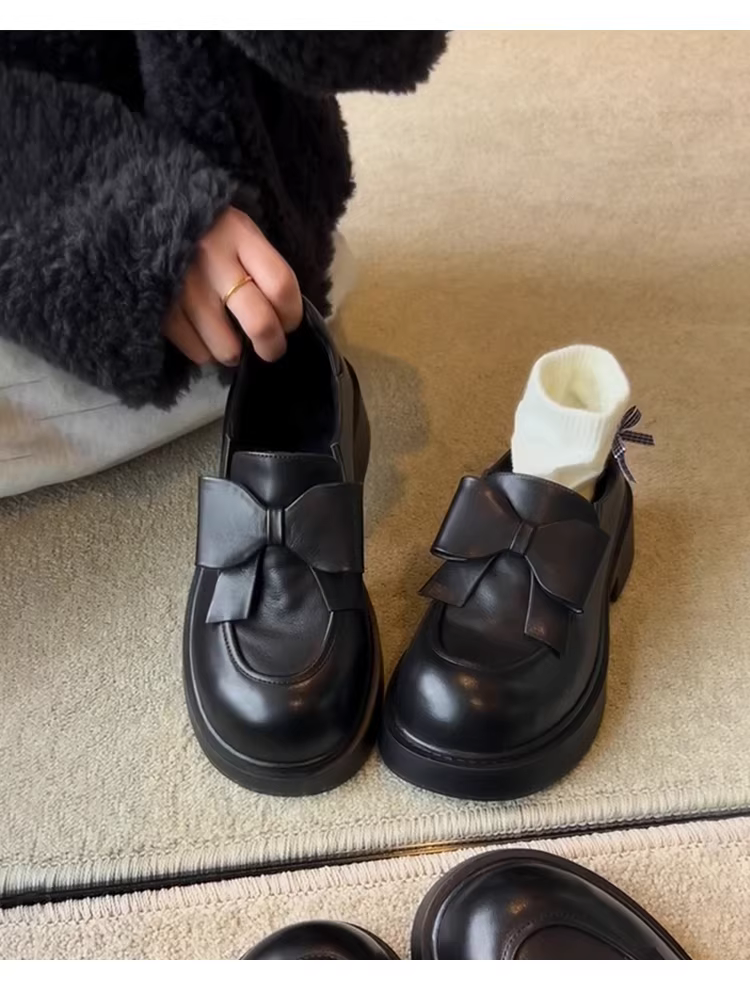 - Phiên bản da cừu ~ Giày lười da thật có nơ lớn dành cho nữ, mũi tròn, đế dày, giày da nhỏ tăng chiều cao