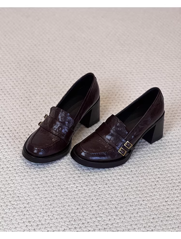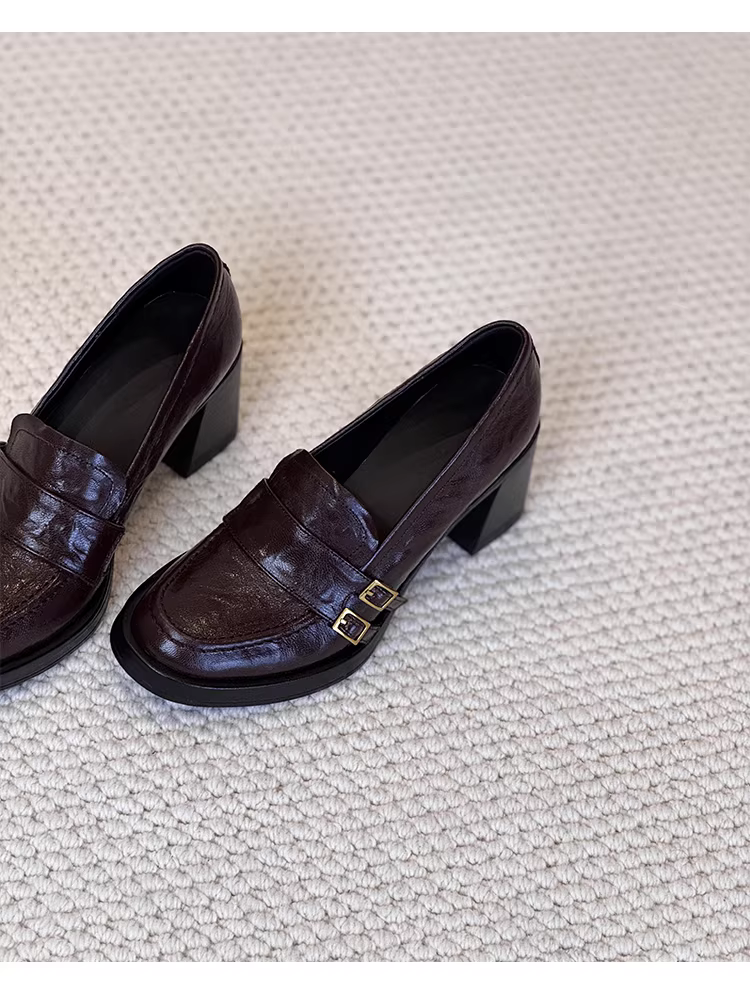- Phiên bản da cừu ~ Giày lười da thật đa năng phong cách cổ điển của Anh dành cho nữ có khóa thắt lưng, giày đi làm cao gót kiểu slip-on
