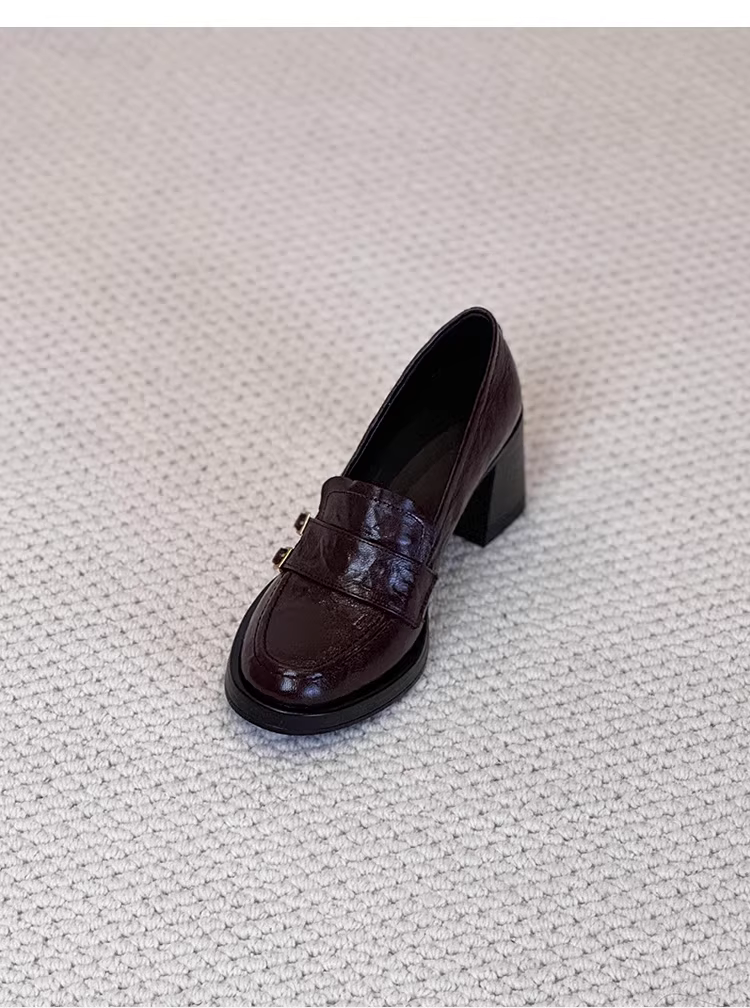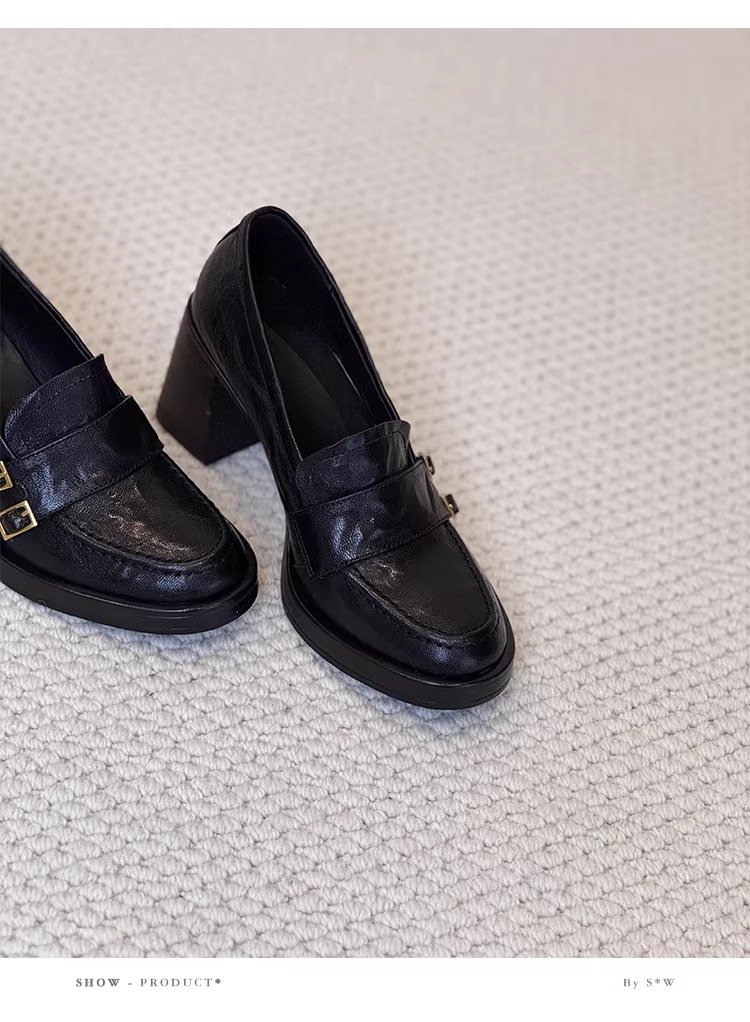 Phiên bản da cừu ~ Giày lười da thật đa năng phong cách cổ điển của Anh dành cho nữ có khóa thắt lưng, giày đi làm cao gót kiểu slip-on