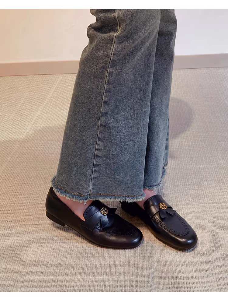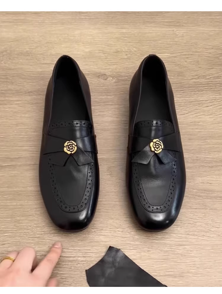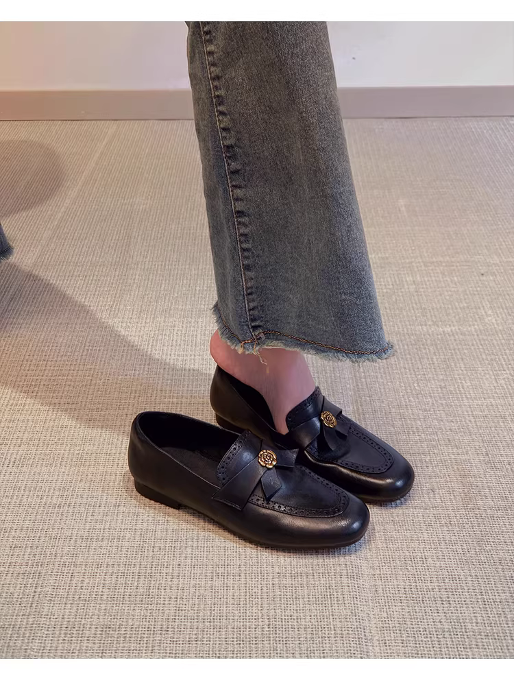 - Phiên bản da cừu ~ Giày lười da thật kiểu Anh dành cho nữ, giày da đế bằng chạm khắc hoa trà đa năng
