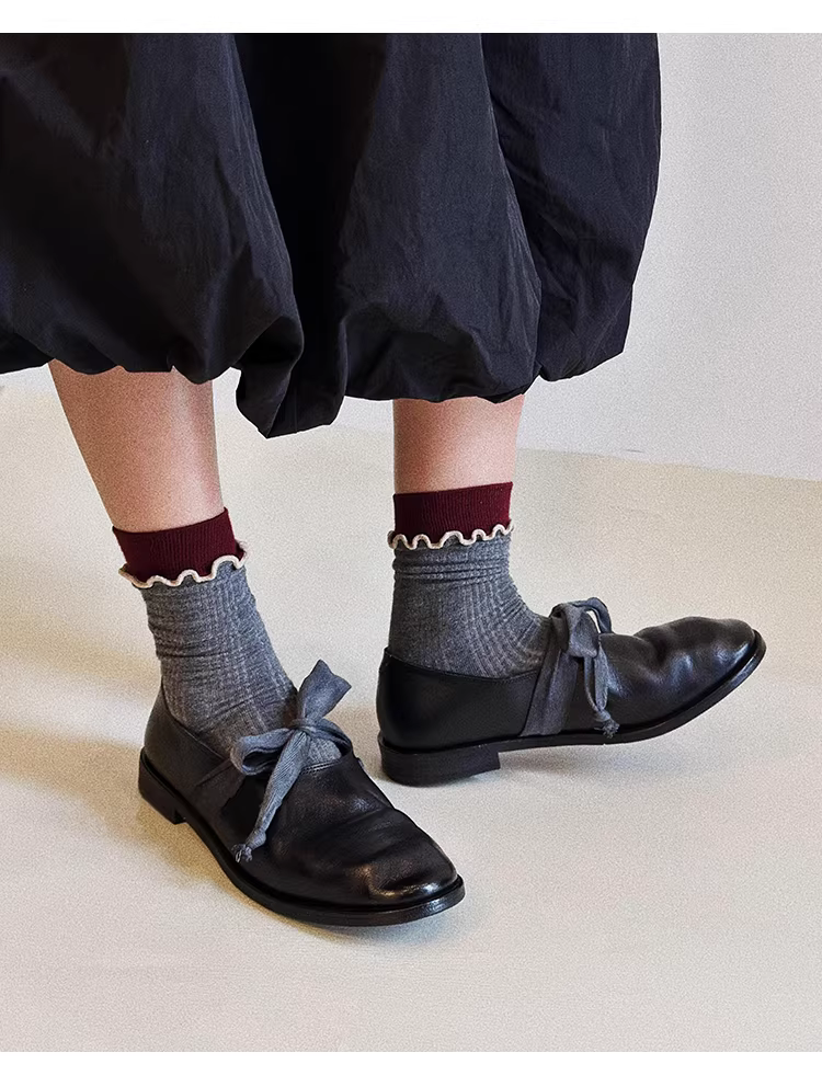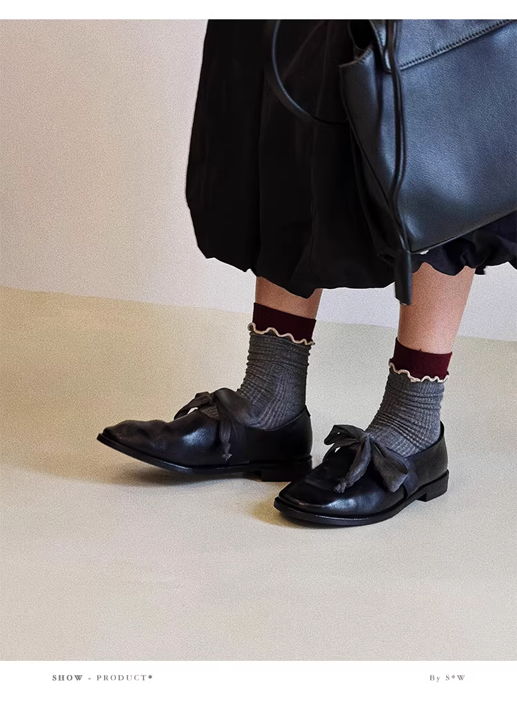 - Phiên bản da cừu ~ Giày lười da thật kiểu dáng nghệ thuật, thiết kế khoét sâu dành cho nữ, có nơ, kiểu lười, gót thấp, đa năng, phong cách retro