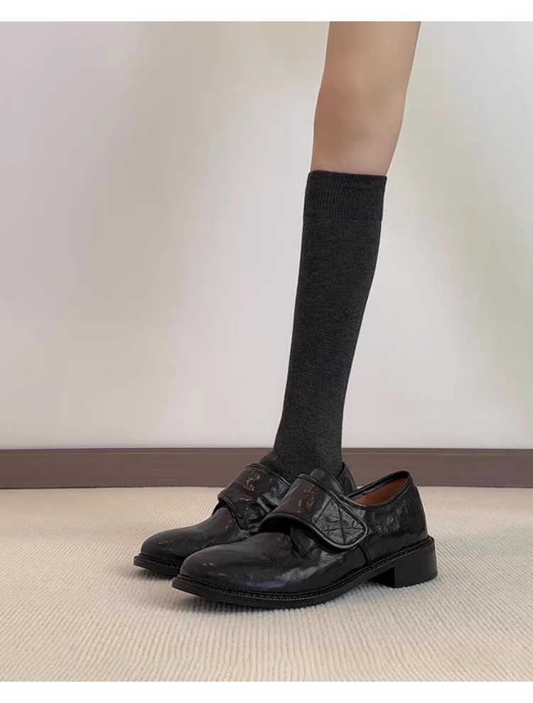 Phiên bản da cừu ~ Giày lười da thật màu đen có khóa dán dành cho nữ, gót thấp, thích hợp đi làm và đi chơi ngoài trời, giày da nhỏ cổ điển.