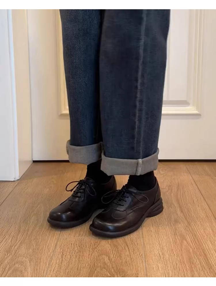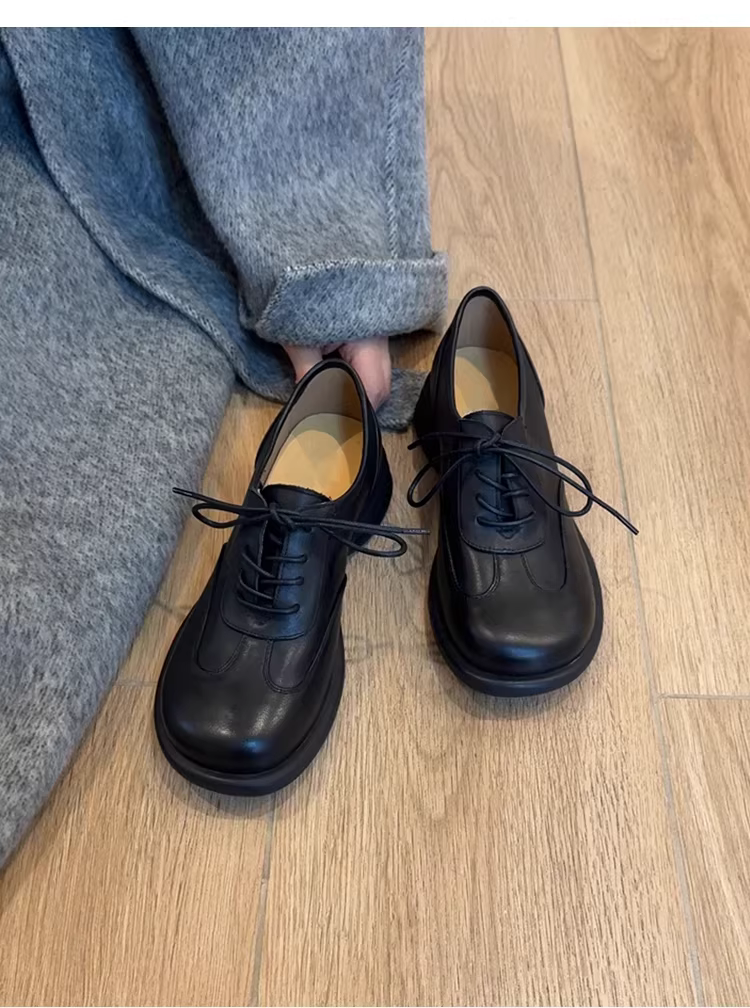 Phiên bản da cừu ~ Giày lười da thật màu đen mới dành cho nữ, đế dày, mũi tròn, buộc dây, giày da nhỏ cắt sâu, giày đơn phong cách Anh.